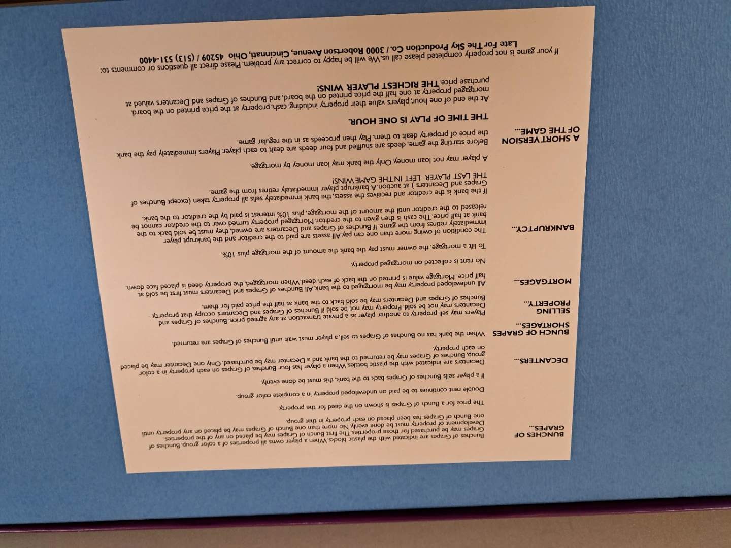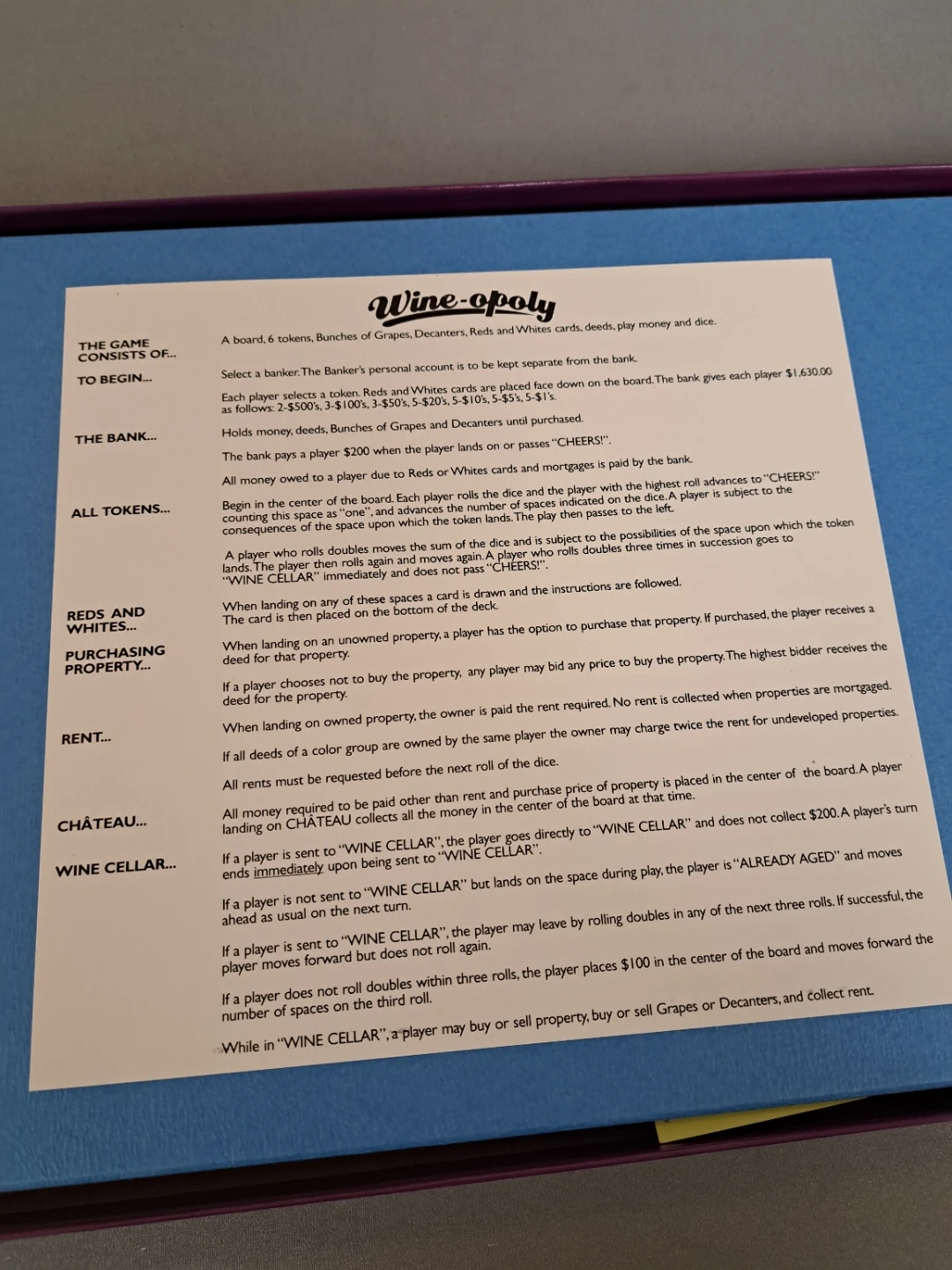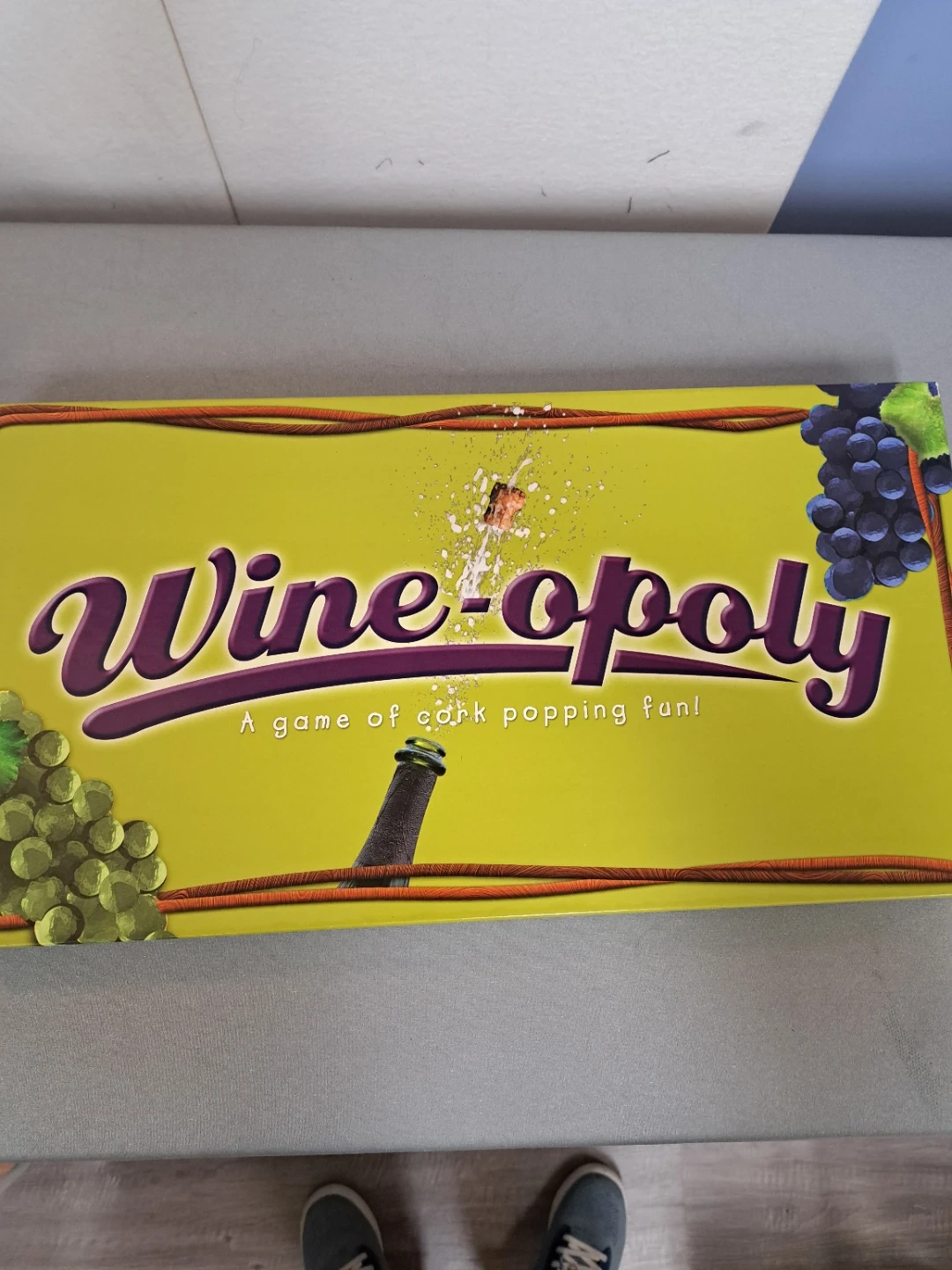 Selling a Wine-opoly board game! It includes a board, tokens, bunches of grapes, decanters, reds and whites cards, deeds, play money and dice. Get ready for a game of cork popping fun! Opened but never played so in great shape.
