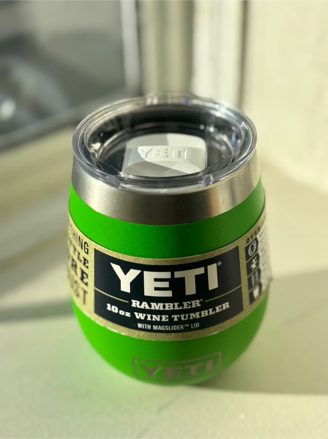 Check out this YETI Rambler 10oz Wine Tumbler! It's in a vibrant green colour and comes with a MagSlider lid. Perfect for keeping your drinks at the right temperature, whether you're at home or on the go