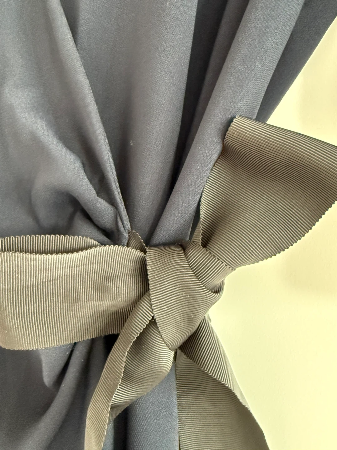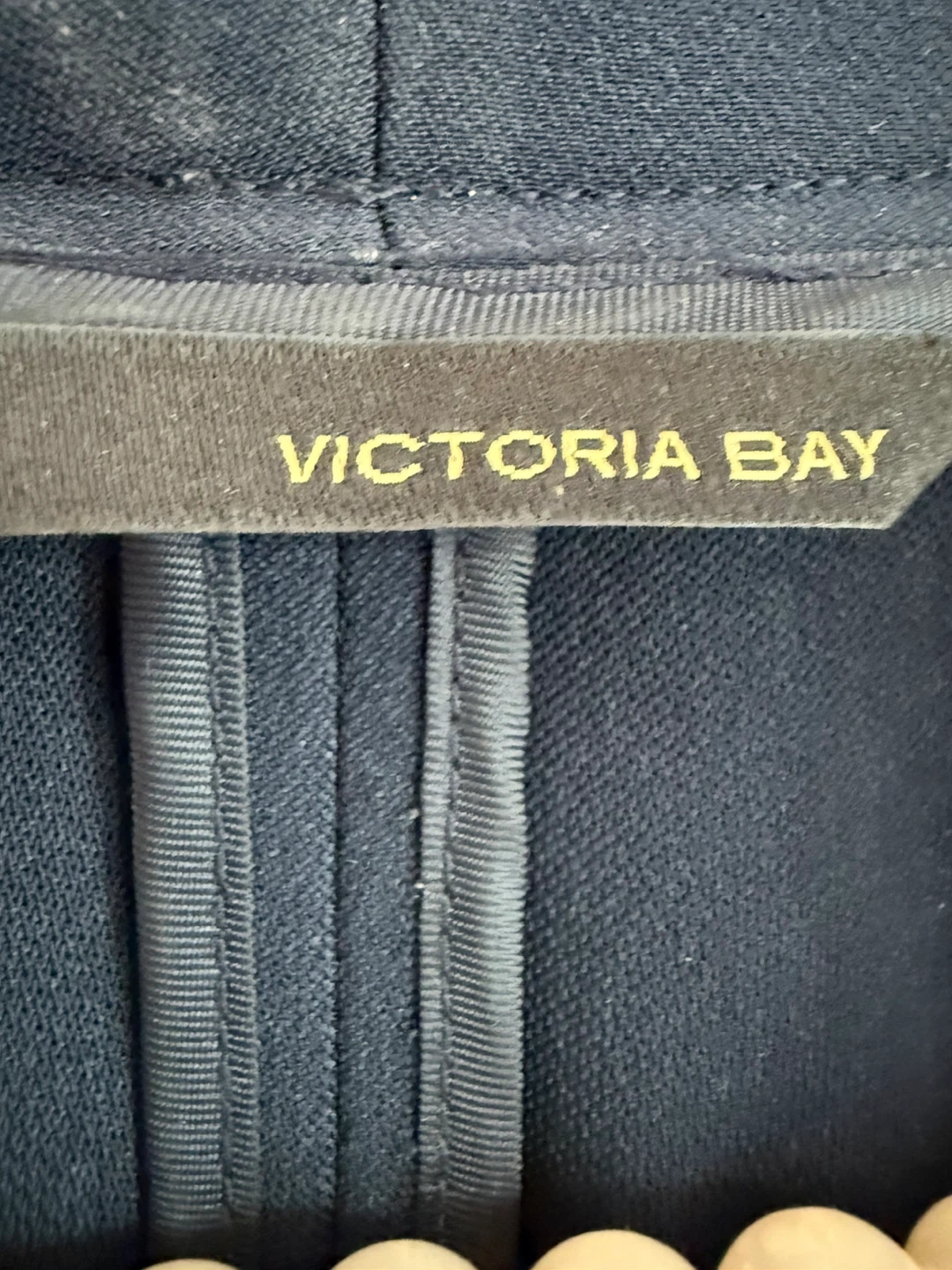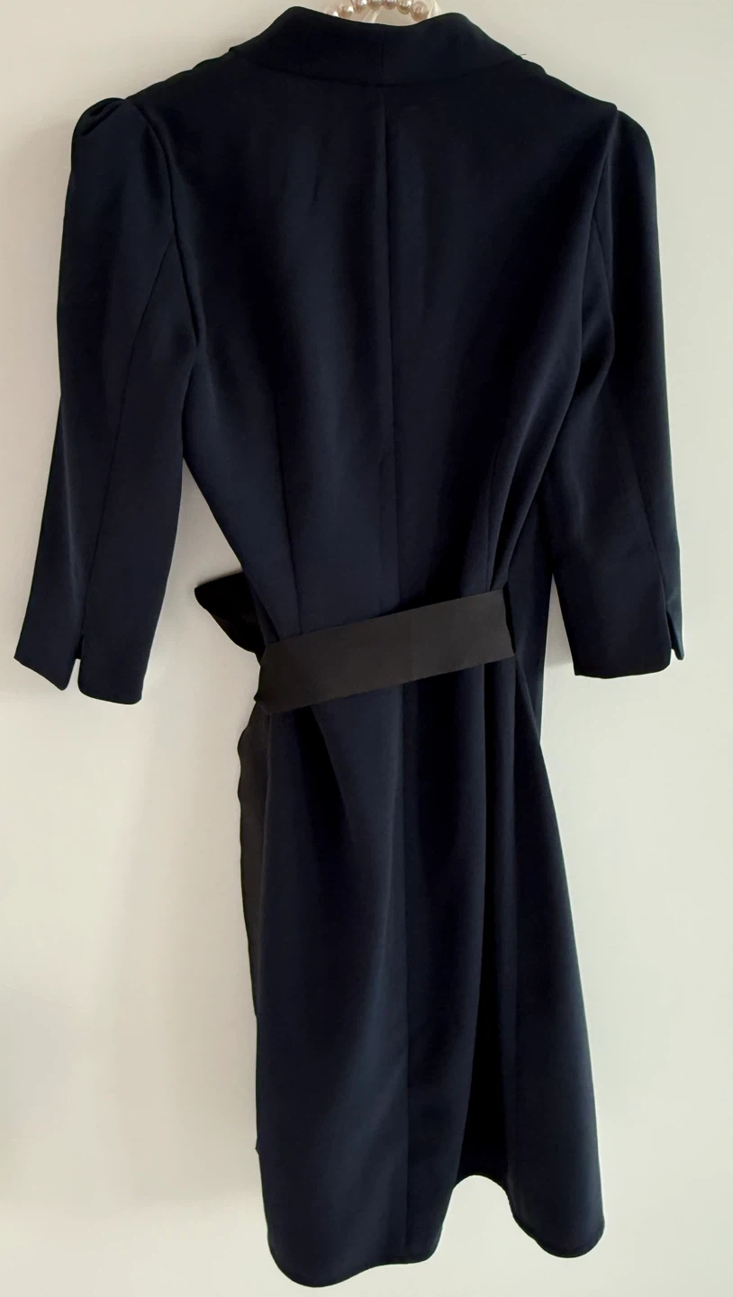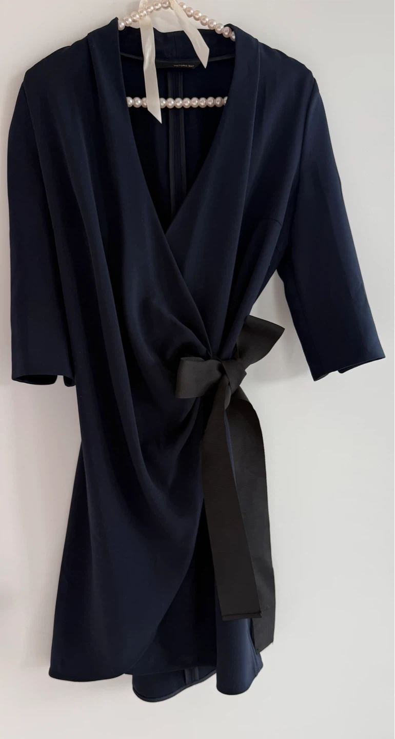 Navy blue wrap dress from Victoria Bay. Features a tie waist detail. Polyester blend fabric.