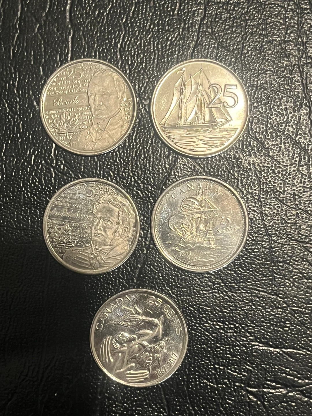 This lot includes five Canadian 25 cent coins, featuring various historical figures and scenes. These coins are great for collectors interested in Canadian numismatics.