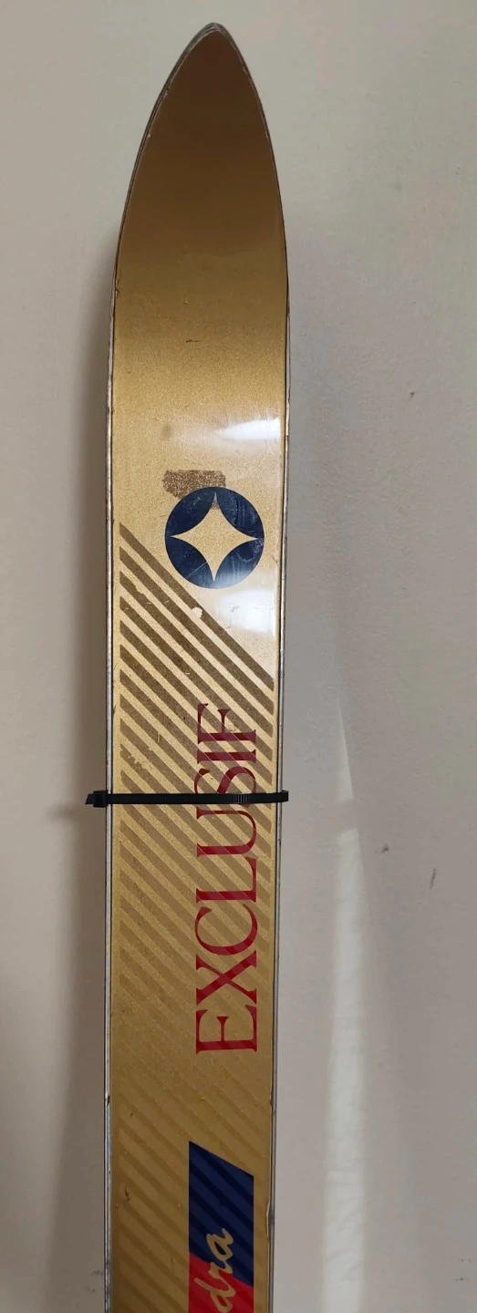Spalding EXCLUSIVE SQUADRA skis featuring a wood core metal sandwich construction. They have a gradual profile and a high molecular weight polyethylene base. These skis are equipped with Tyroila 430 bindings.