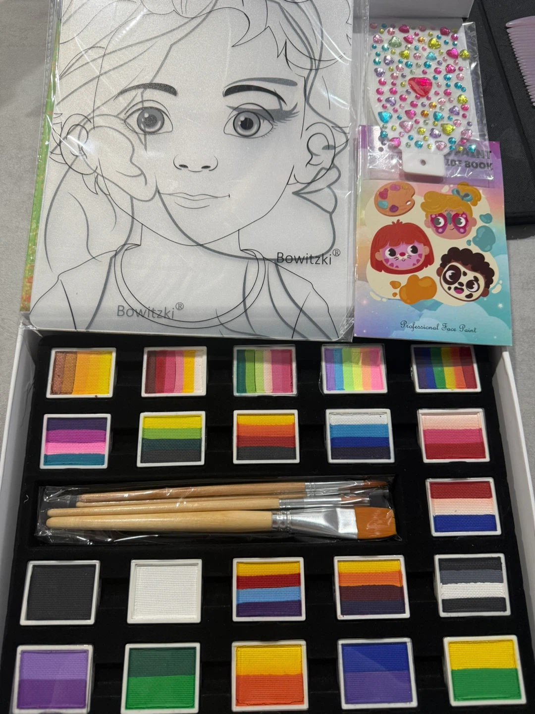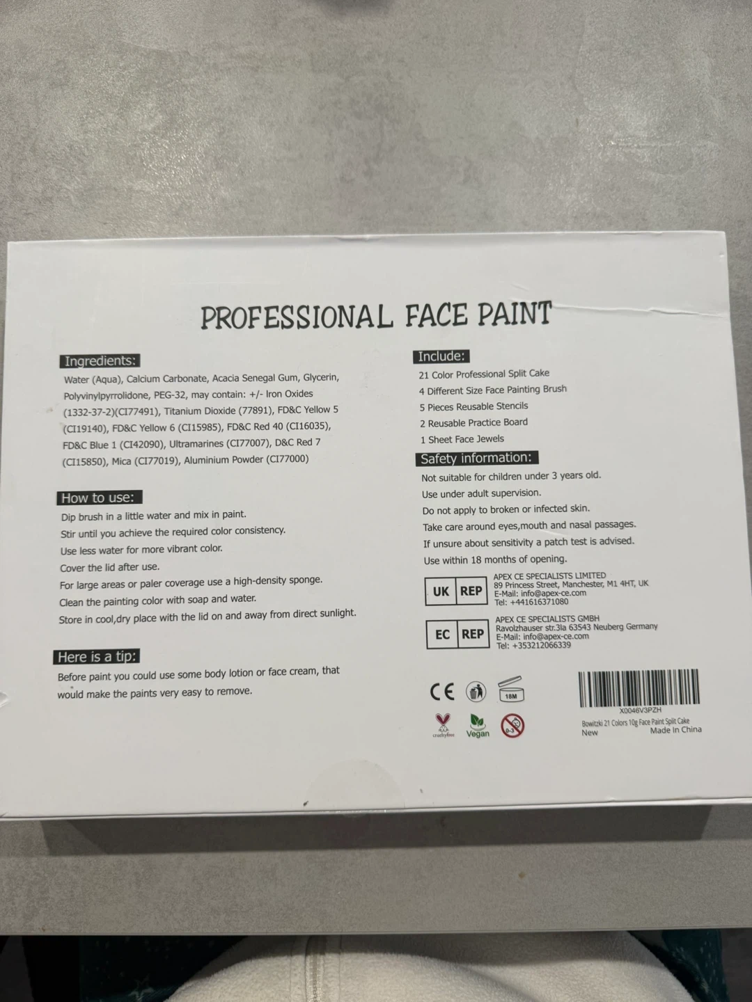 This professional face paint set includes 21 colours and 4 brushes. It also comes with reusable stencils and a practice board. Great for Halloween or Easter events!
