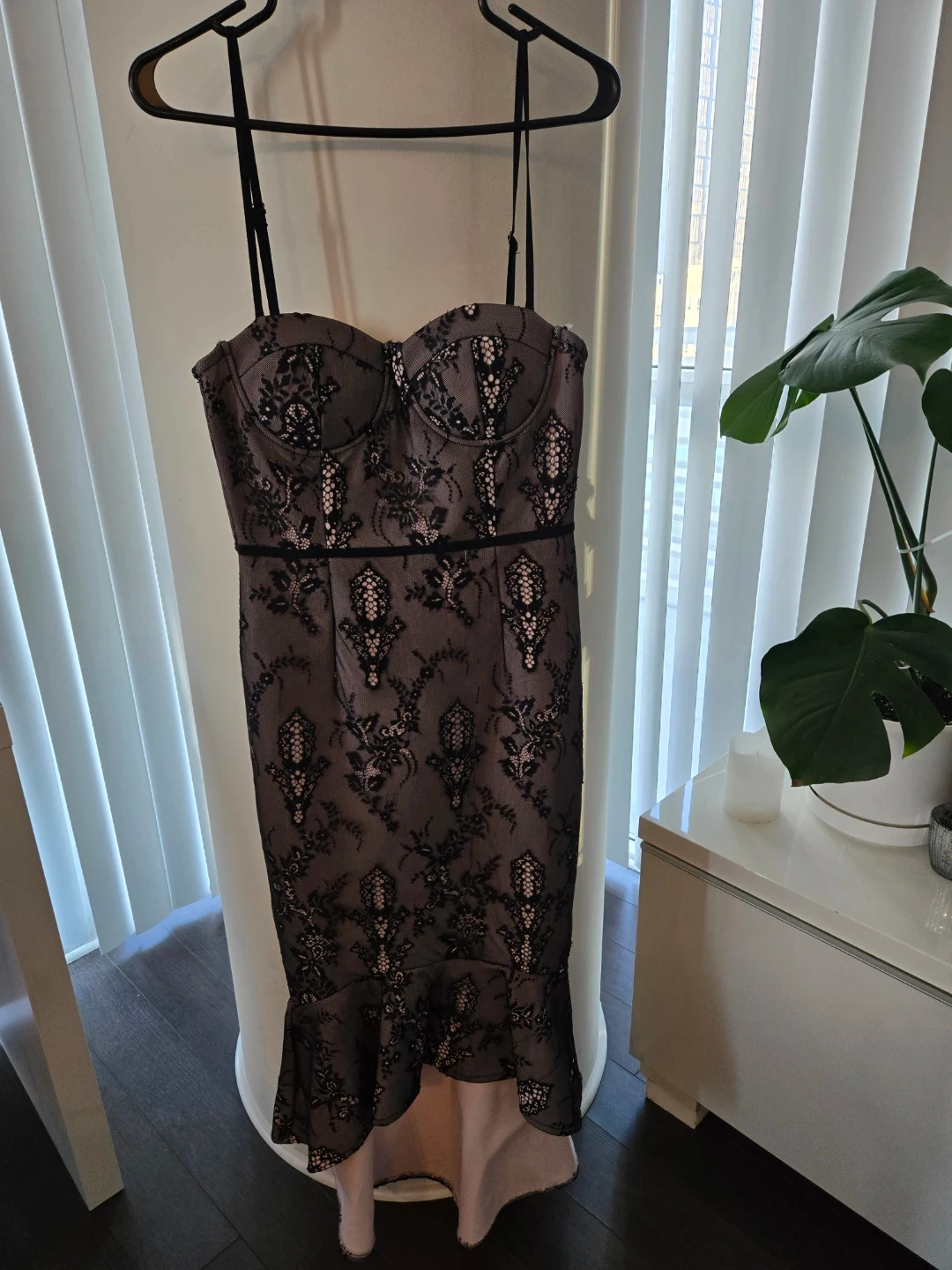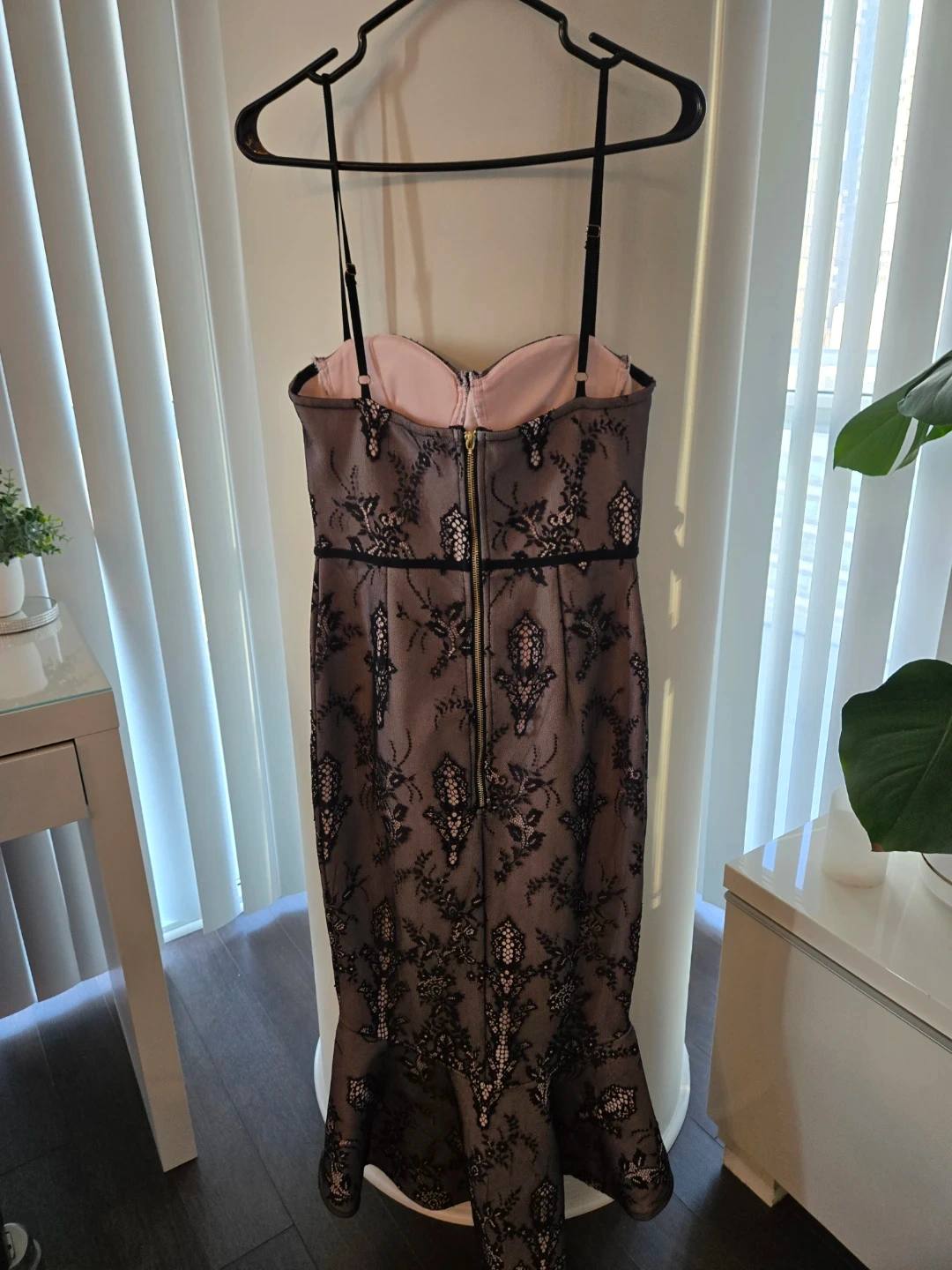 This bandage dress features black lace overlay with a pink lining. It has a fitted bodice and a trumpet hemline. Great for a fancy night out! Tab for the zipper as pictured is missing.
