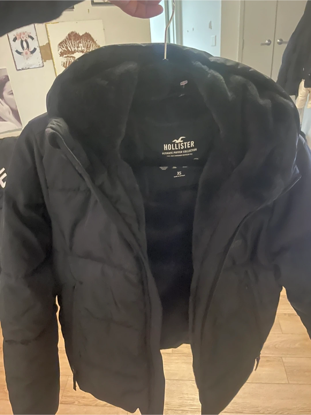 It's a Hollister Ultimate Puffer Collection jacket in black. It's a size XS. This puffer jacket is designed for warmth and comfort. Brand new never worn pet and smoke free home.