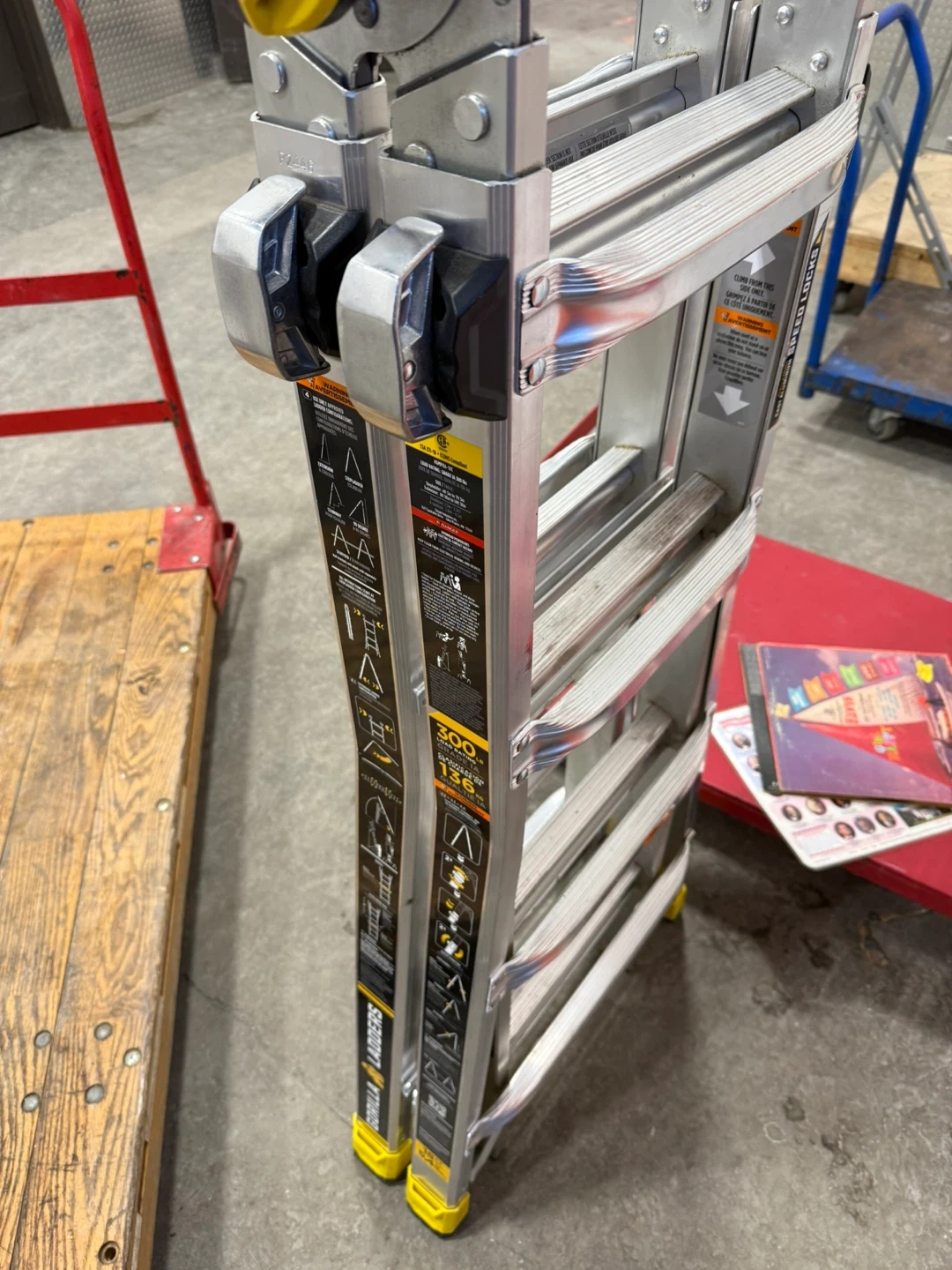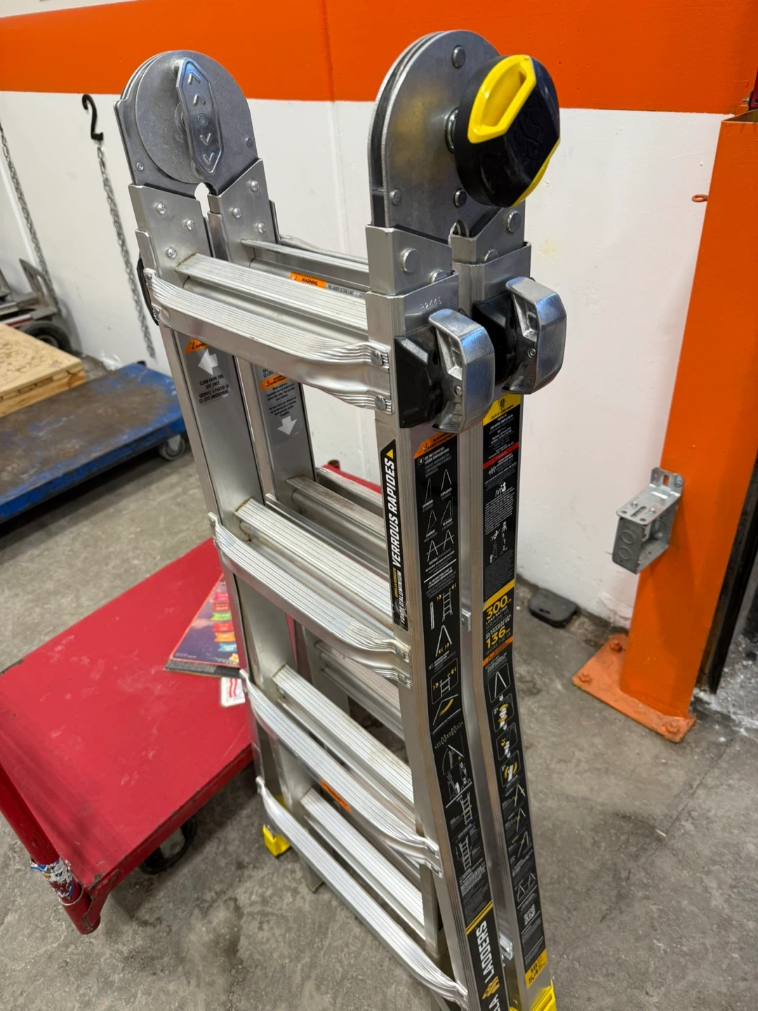 Gorilla Ladders multi-position ladder. It's 18 ft. and has a weight capacity of 300 lbs. Made of aluminum.