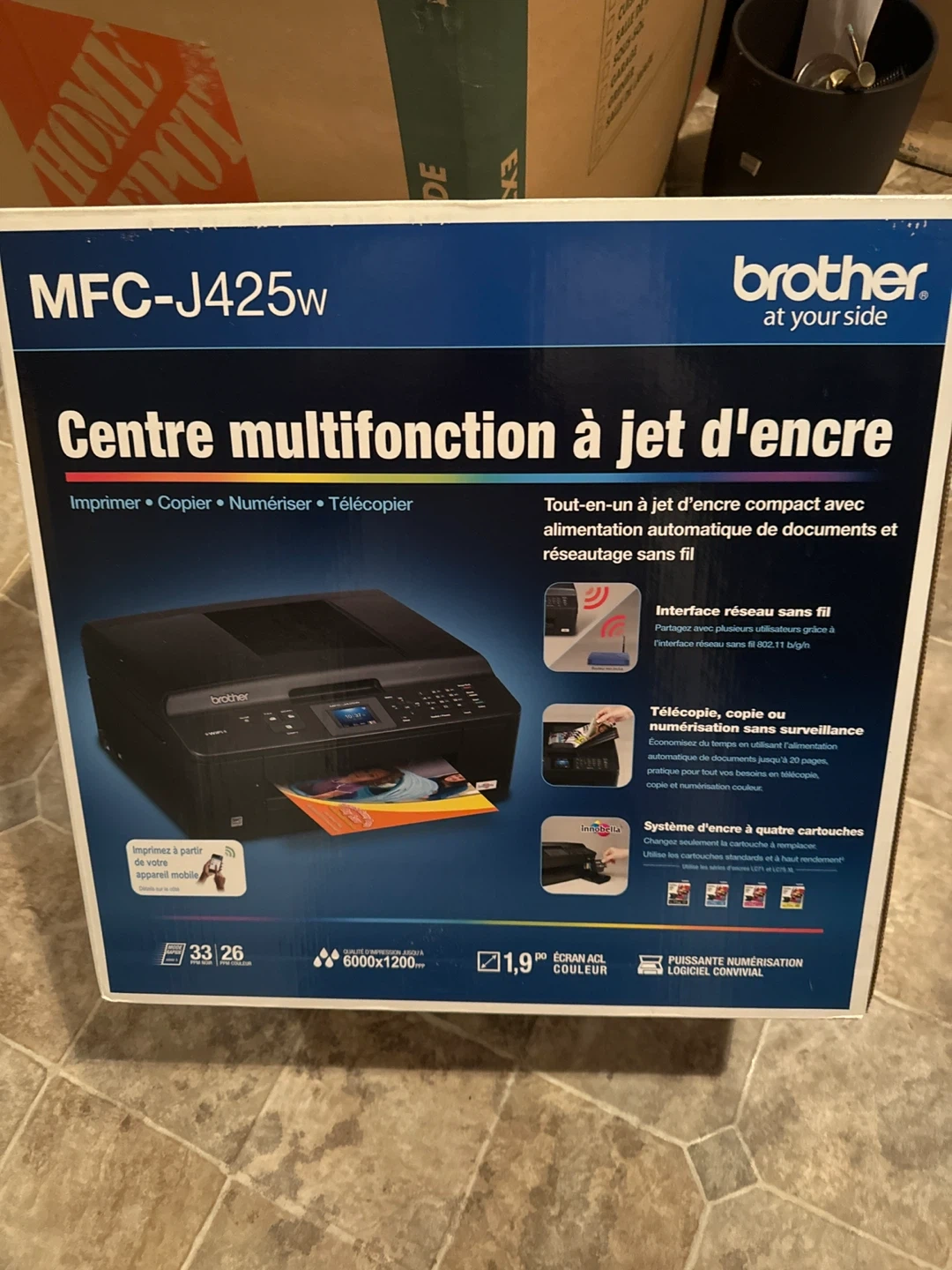 This Brother MFC-J425w is an all-in-one inkjet printer. It's compact with automatic document feeding and wireless networking. It has print, copy, scan, and fax functions and a 1.9-inch colour LCD screen.