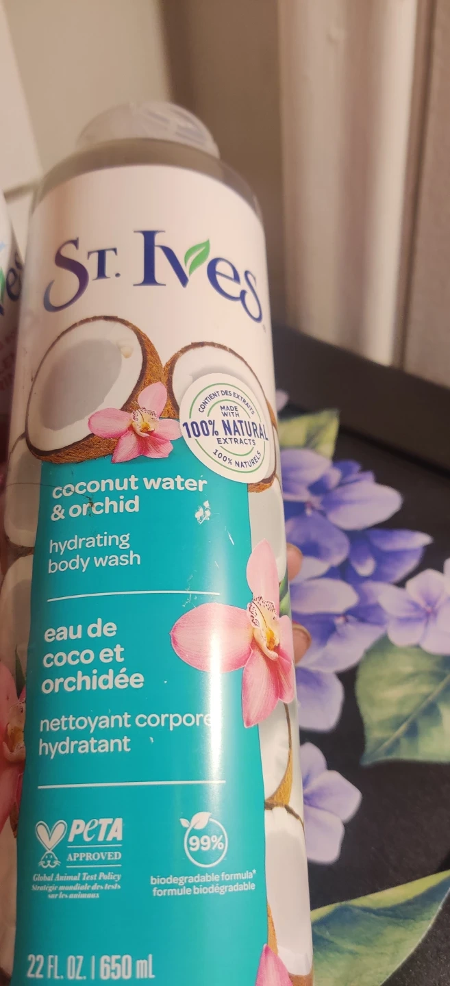 These St. Ives body wash is made with 100% natural coconut water and orchid extracts. It's a hydrating formula that hydrates for soft skin. The bottle is made from 100% recycled plastic. This is a great body wash for daily use to keep your skin feeling soft and refreshed.