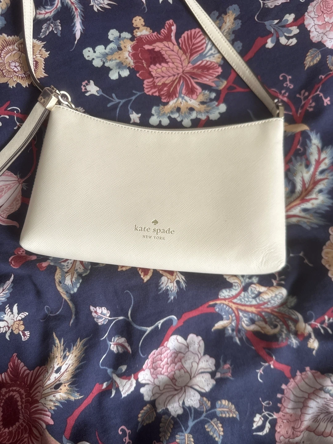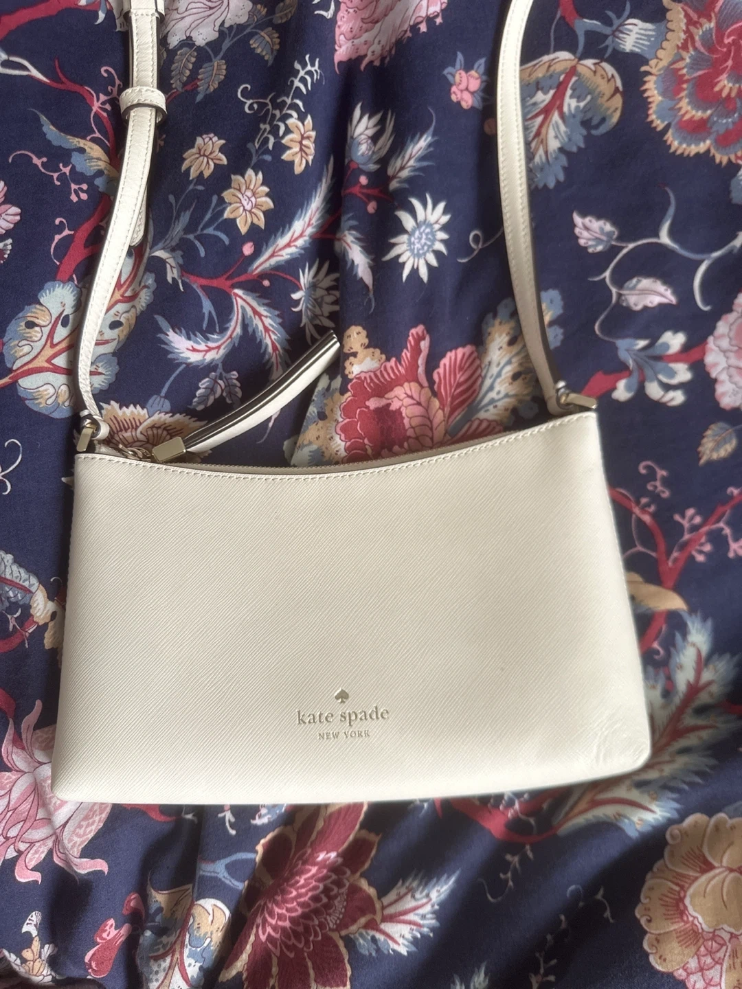 A classic white crossbody bag from Kate Spade New York. It's made of textured leather and has a zip-top closure. This versatile bag is perfect for carrying your essentials.