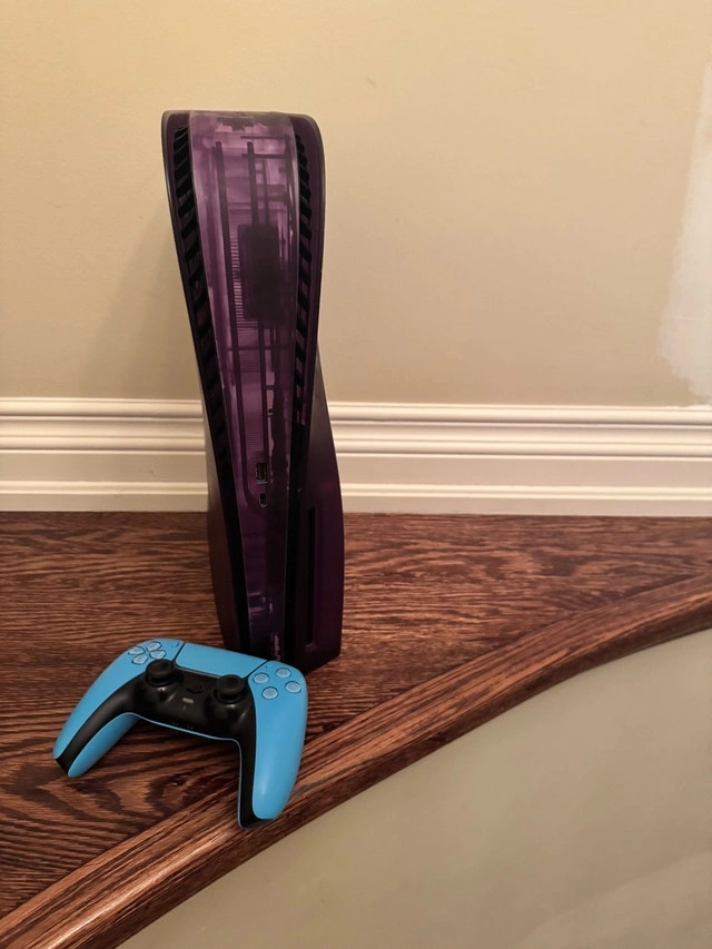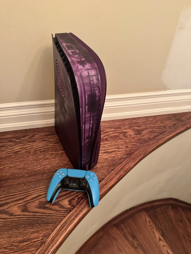 Selling a used PlayStation 5 disc edition with a custom purple shell and a blue controller. The console is in good condition and works perfectly. It's a real head-turner and will definitely add some flair to your gaming setup! This is a used console. * Custom purple shell * Blue controller * Disc edition
