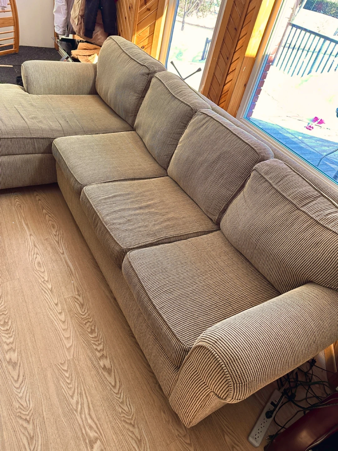 Beautiful and spacious right-facing sectional sofa with chaise in a warm Tan woven fabric. This is a solid, well-built Canadian-made sectional with durable textured upholstery.