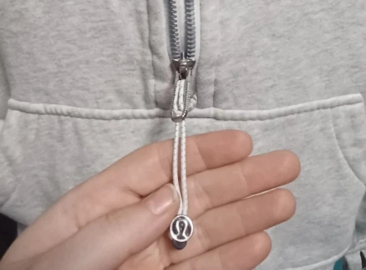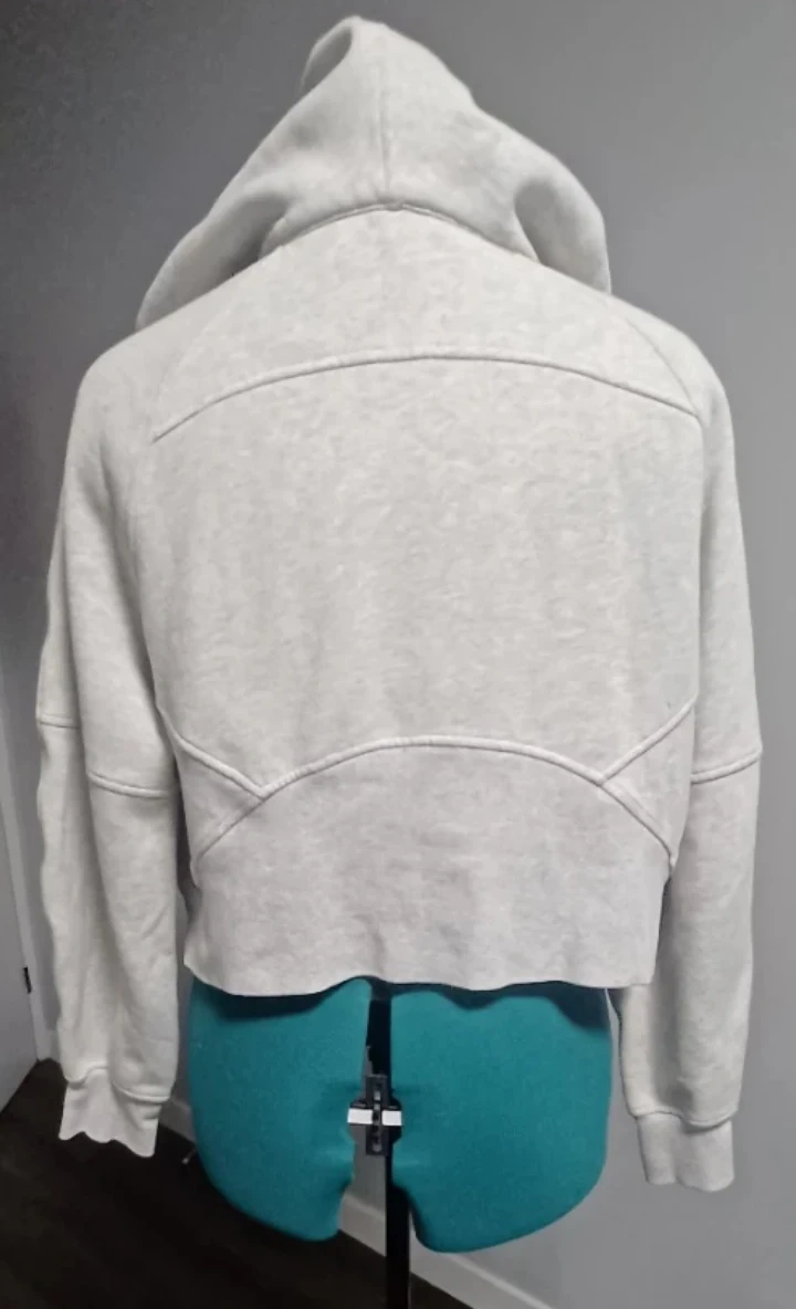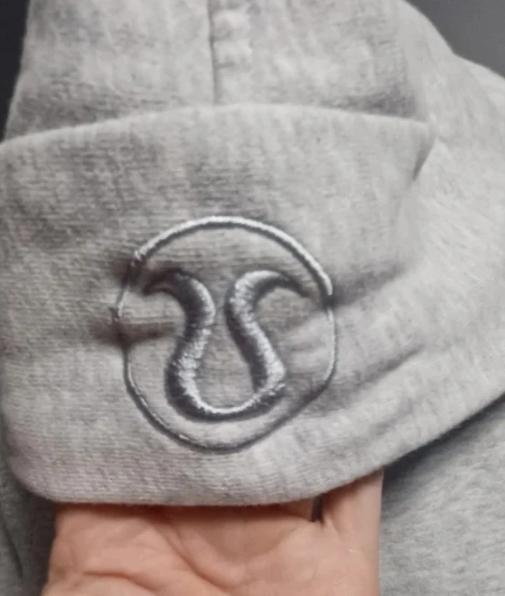 Grey Lululemon hoodie with a half zip closure and a front pouch pocket. It has thumb holes in the sleeves. Made from a soft, comfortable fabric.