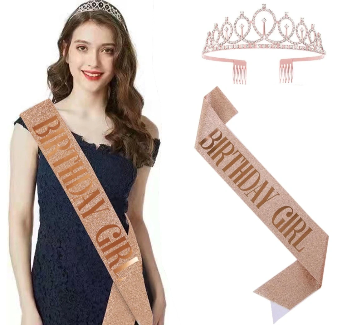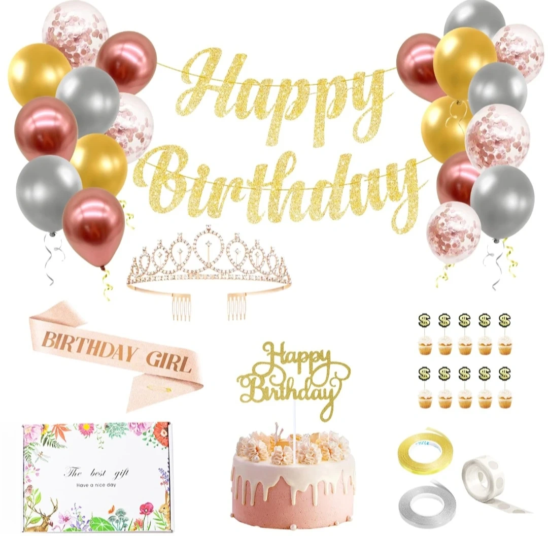 This birthday party decoration set includes a 'Happy Birthday' banner, balloons, a tiara, a 'Birthday Girl' sash, and cupcake toppers. It's everything you need to make a birthday celebration special!