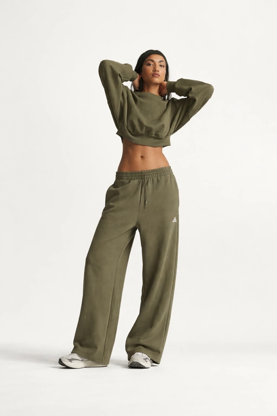 Comfortable Adidas wide leg sweatpants in an olive green colour. Elastic waistband with drawstring. It's made from a soft, luxurious fabric for all-day wear. Great for lounging or casual outings!