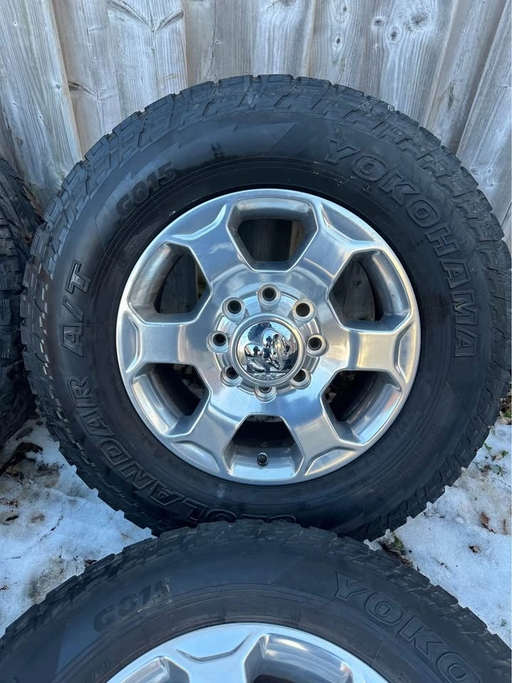 Set of OEM 18-inch rims with Yokohama A/T tires, came off a 2017 Ram 2500. Bolt pattern is 8x6.5, tire size LT275/70R18. Tires have OK tread left. Pickup in Oakville. All prices are subject to HST. We accept credit, debit, e transfer, & cash!
