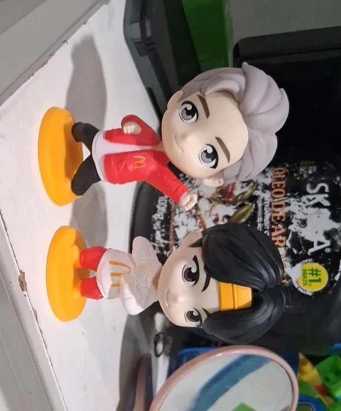 Two collectible figurines featuring characters from the McDonald's BTS collaboration. Each figurine stands on a yellow base. They're great for fans of the group or McDonald's promotions!