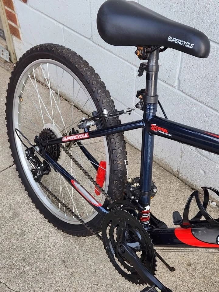 Sturdy Supercycle SG1500 mountain bike. Black and red frame with a kickstand and water bottle holder. Has good tires and all gears work. Great for cruising around or hitting some trails. For ages of 13-18 years. Pick up location between Sheppard and Jane Street.
