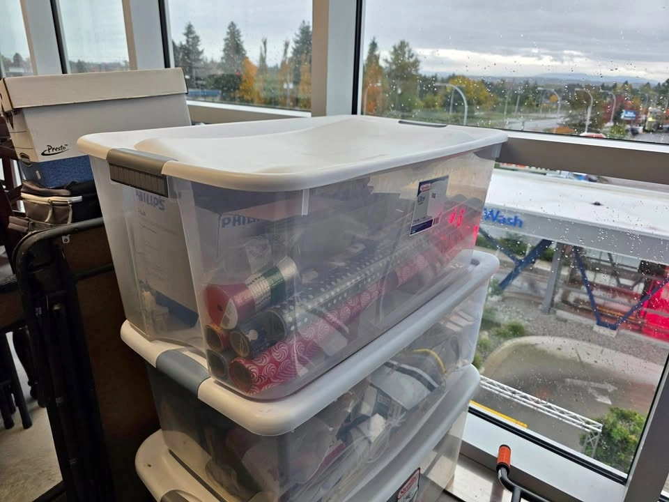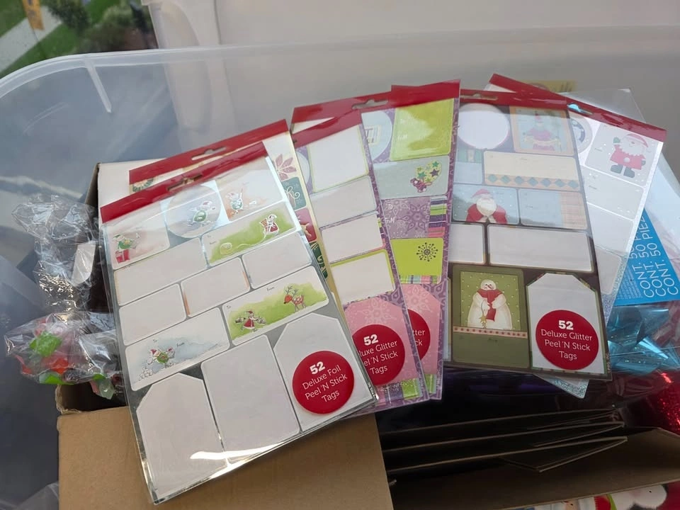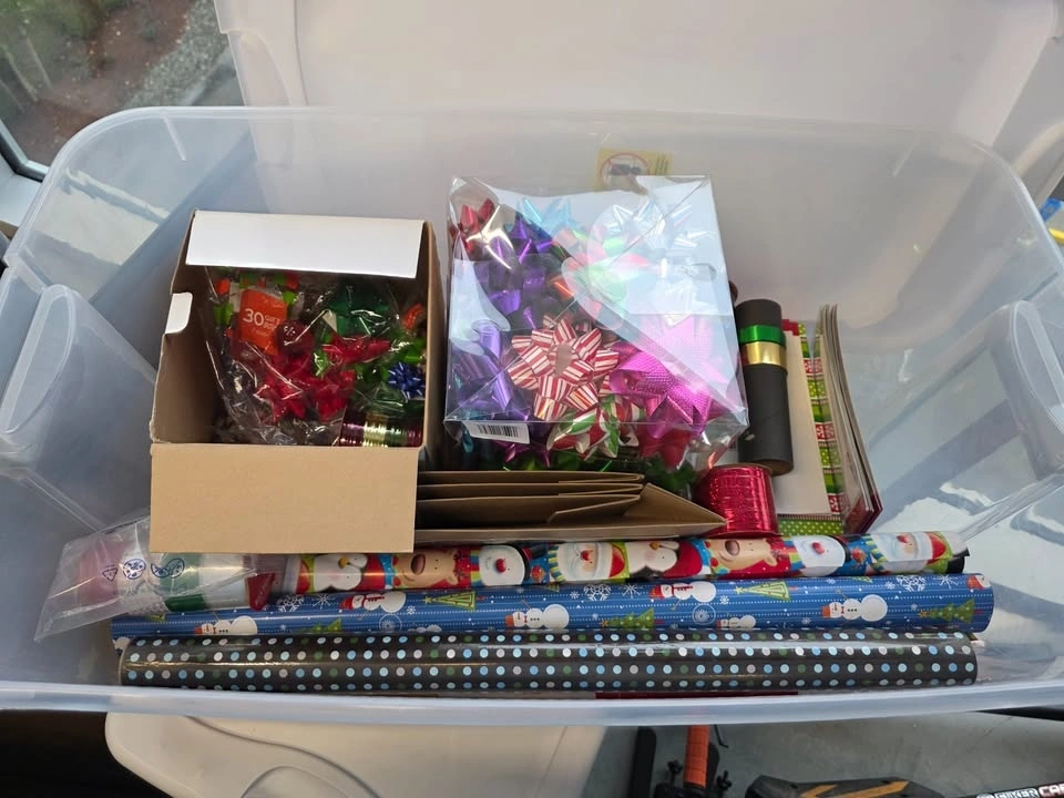Packed with wrapping paper, ribbons, and gift tags
