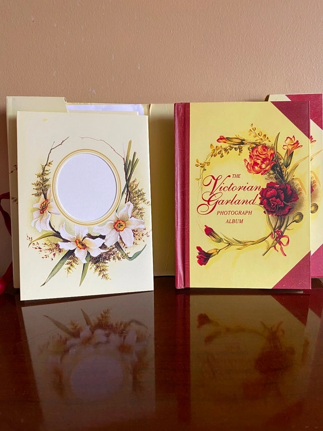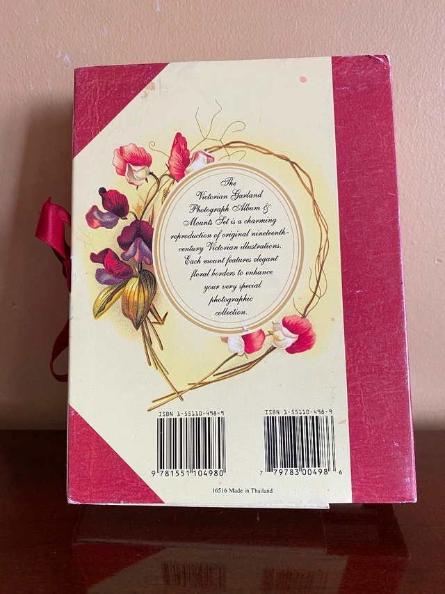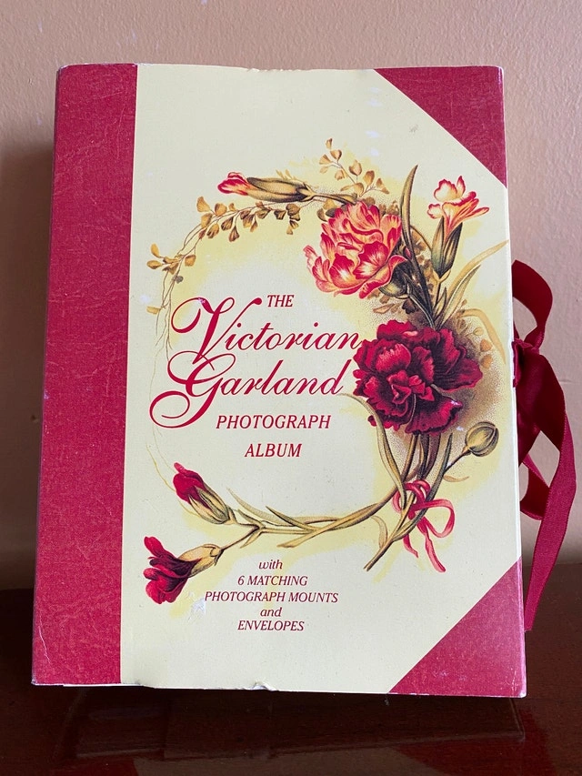 Vintage-style photograph album with a beautiful floral Victorian design. It features a cream background with deep red floral artwork and accents, and a matching deep red ribbon tie closure. The front cover has an elegant script title. Selling for $20.