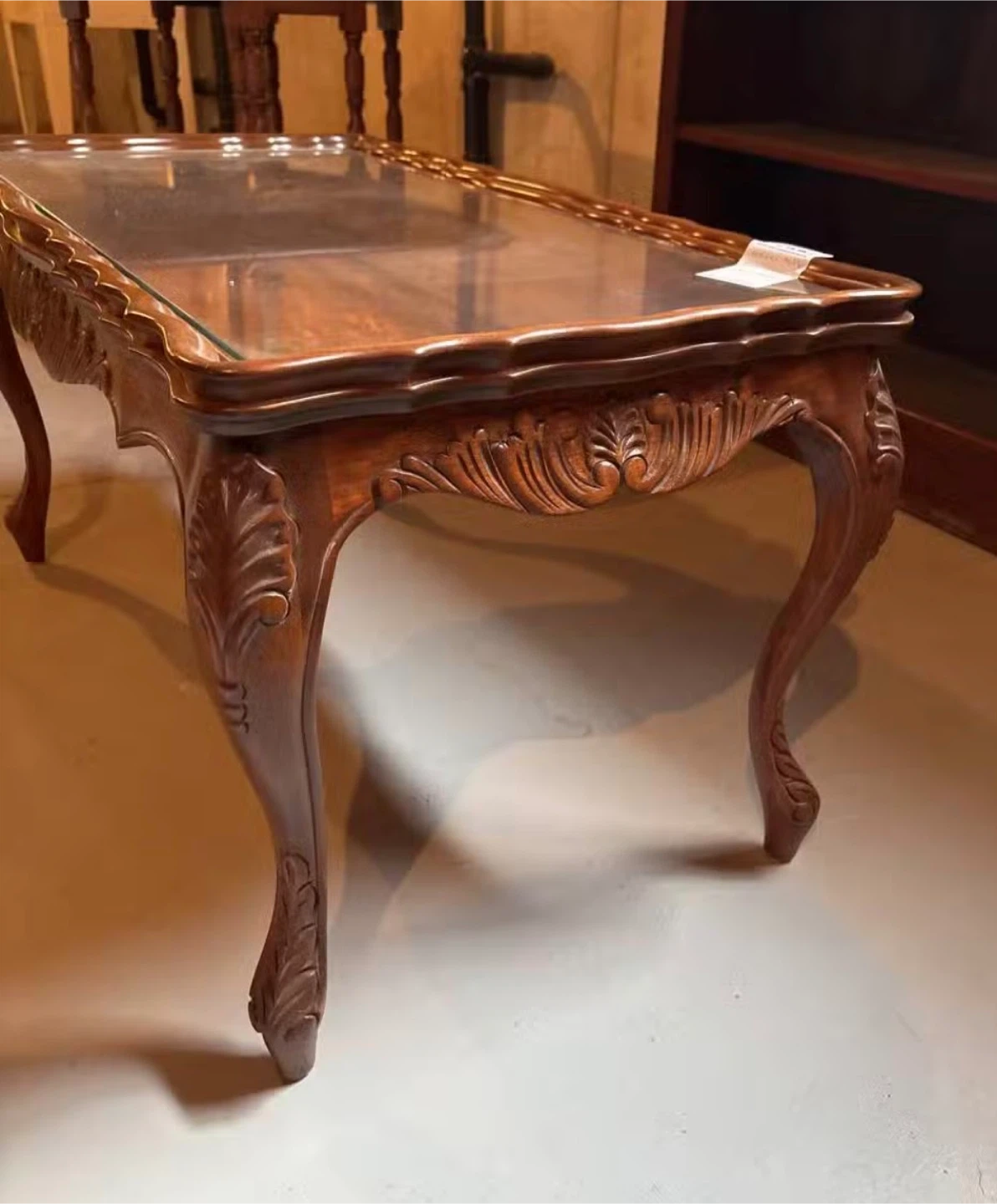 Lovely coffee table with detailed wood carvings. It features a durable glass top inset into the wooden frame. This table adds an elegant touch to any living space.