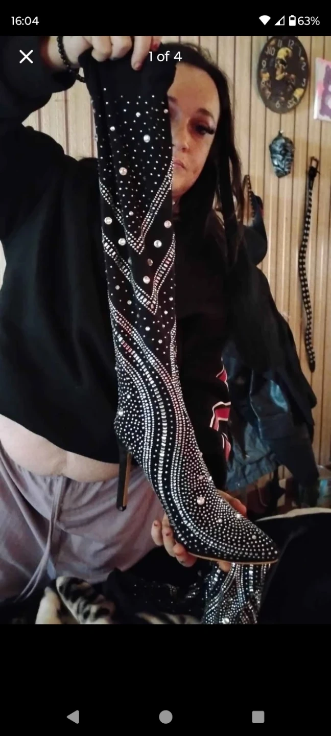These stunning black boots are covered in dazzling rhinestones! They feature a pointed toe and a sleek stiletto heel, perfect for making a statement. These boots are designed to turn heads!