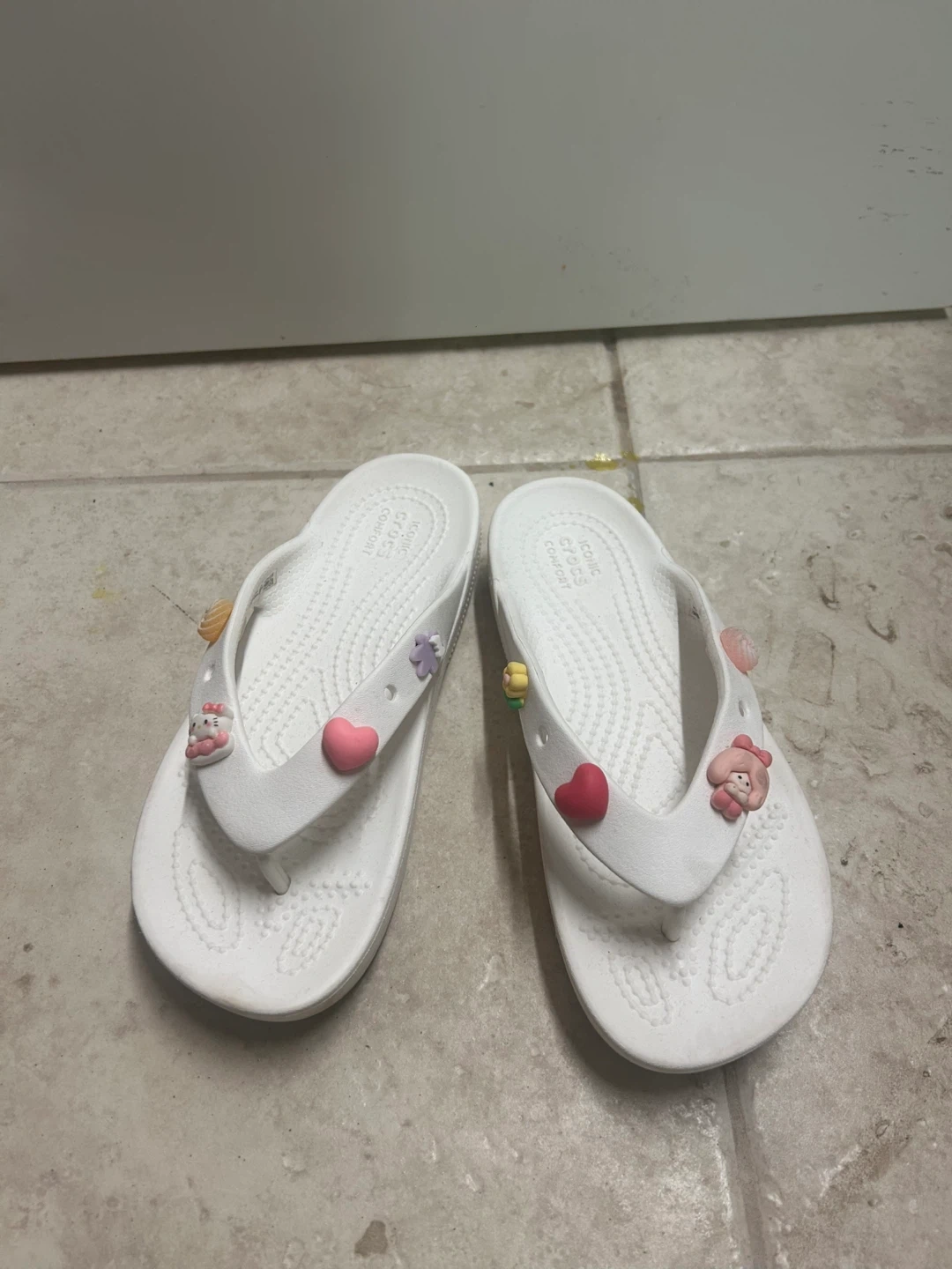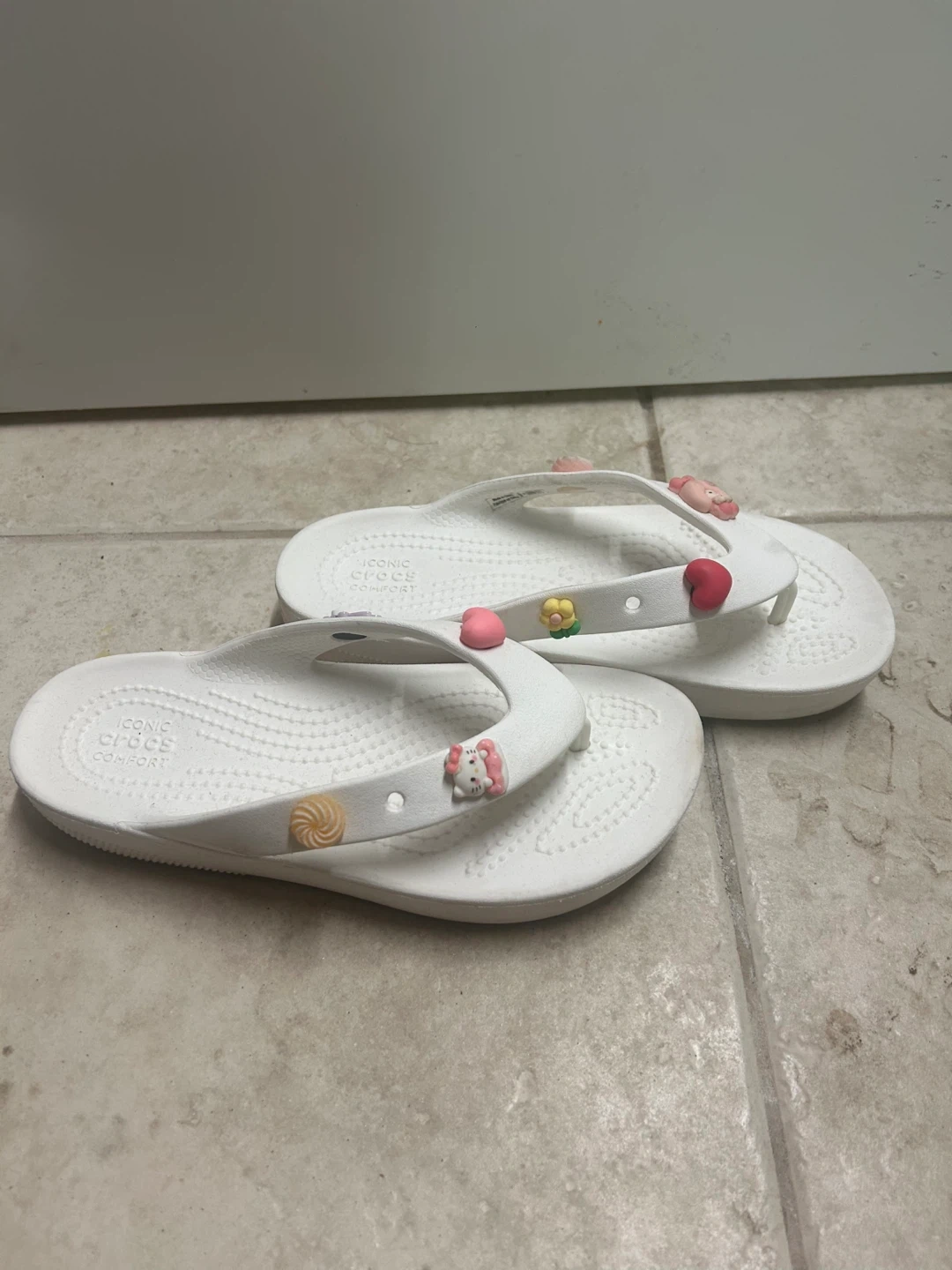 Comfortable white Crocs flip flops adorned with cute charms. These slip-on sandals are perfect for casual wear and warm weather. They feature the iconic Crocs comfort footbed.