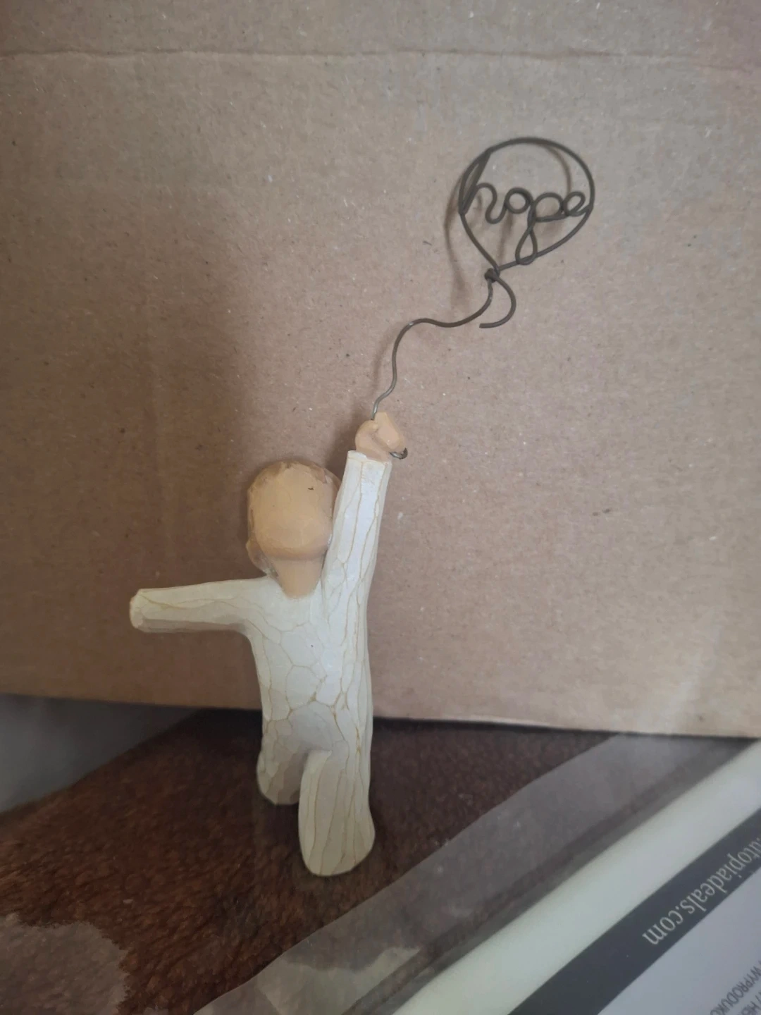 This Willow Tree figurine depicts a child holding a balloon with 'hope' written on it. It's made of resin with a carved wood look. This piece is great for display or as a thoughtful gift. (Missing a hand but still looking great)