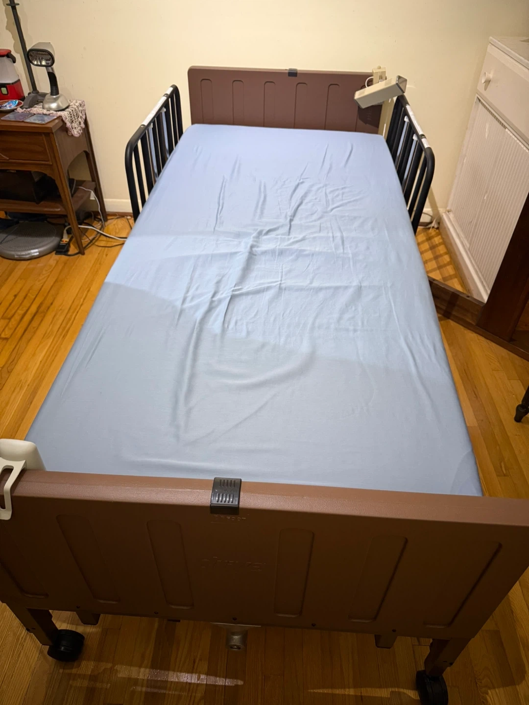 This is an adjustable hospital bed. It features a brown frame and a light blue mattress. The bed's height and position can be adjusted to suit different needs. It's equipped with side rails for safety and mobility wheels.
