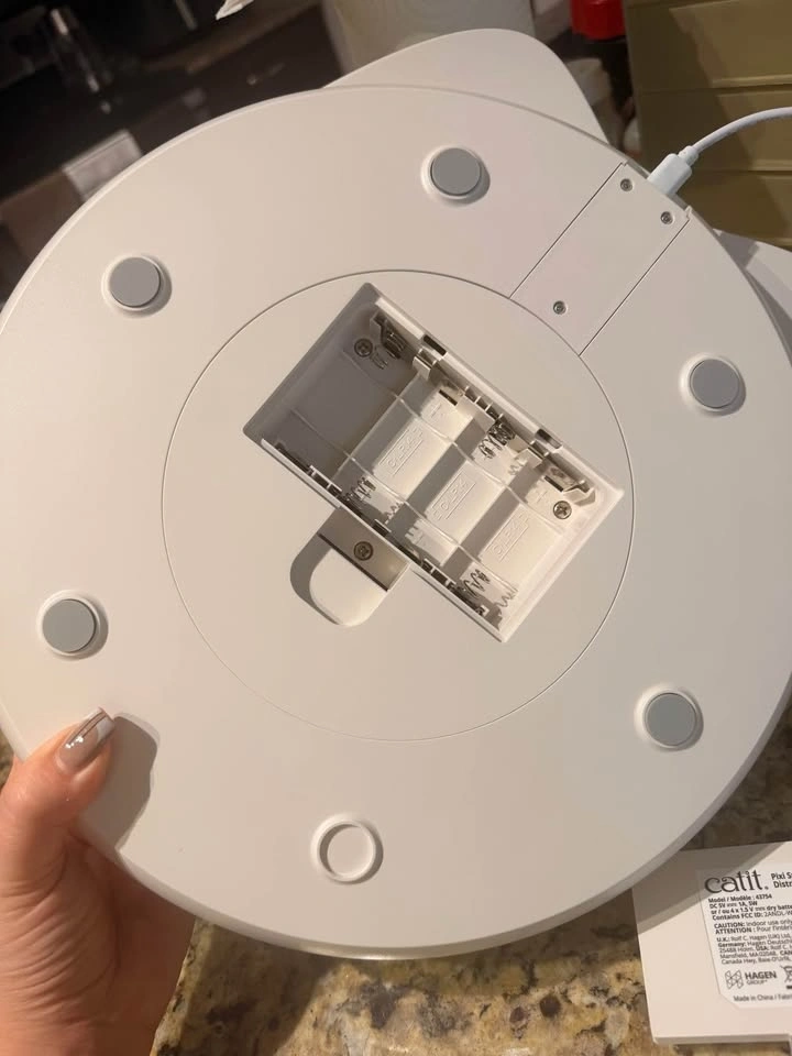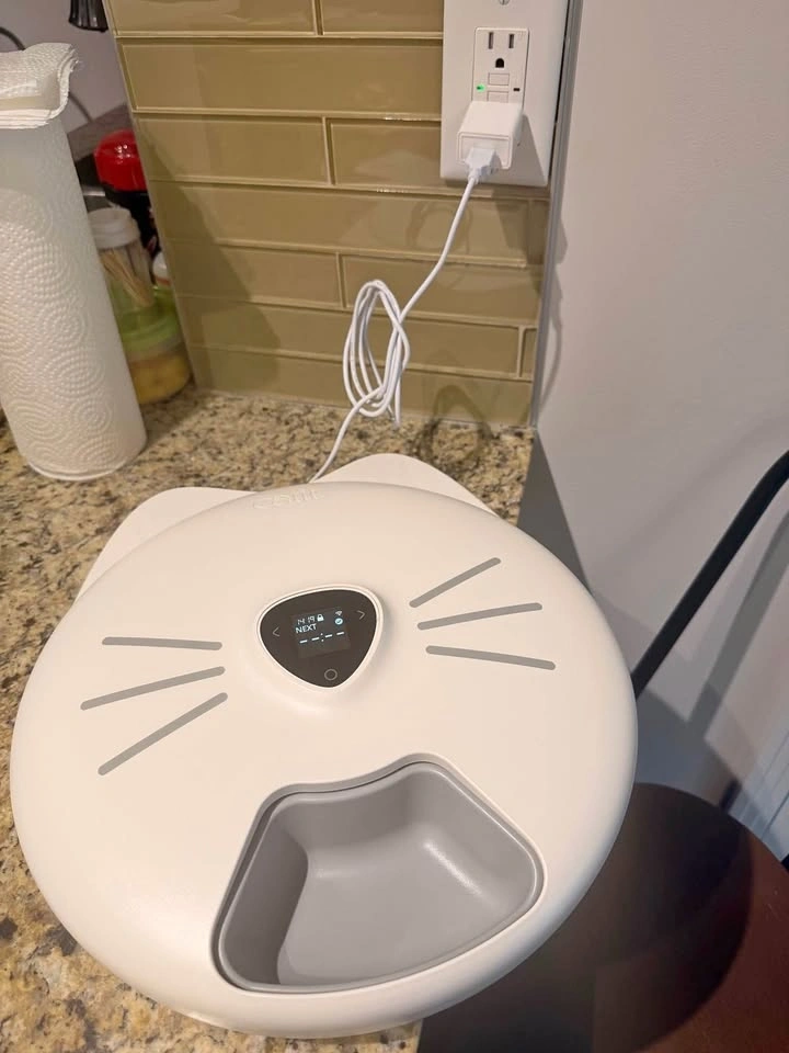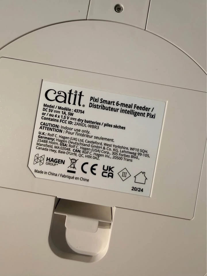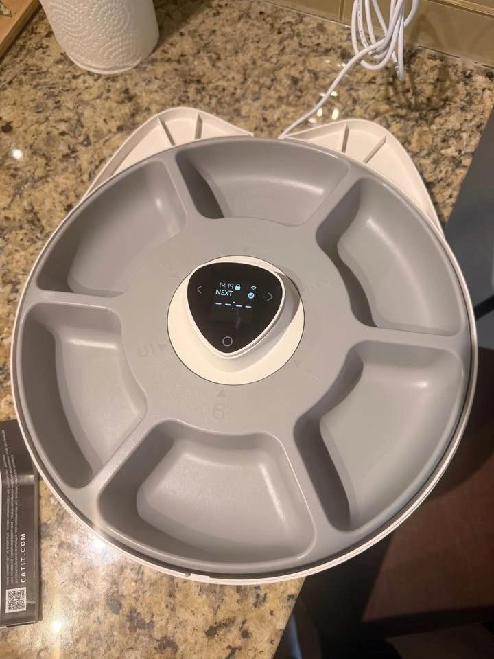 Clean Catit Pixi Smart 6-meal Feeder with 6 compartments. Includes 2 cold elements to keep wet food fresh. This automatic pet food dispenser is USB powered or can use 4x AAA batteries for backup (batteries not included). Programmed via phone app. Great for cats or small dogs. Pick up at Terwillegar.