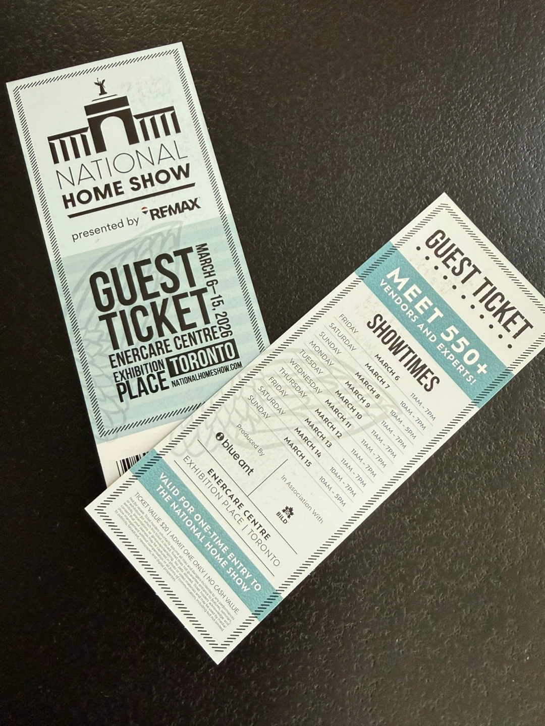 Giving away x2 guest tickets for the National Home Show held at Enercare Centre, Exhibition Place, Toronto. It's valid for one-time entry until Sunday March 16, 2026.
