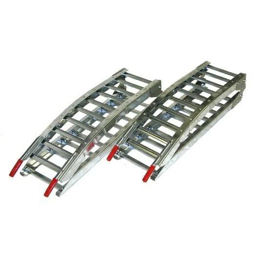 Set of two aluminum loading ramps. These ramps are foldable for easy storage and transport. They're suitable for loading ATVs, motorcycles, or other equipment into a truck bed or trailer.