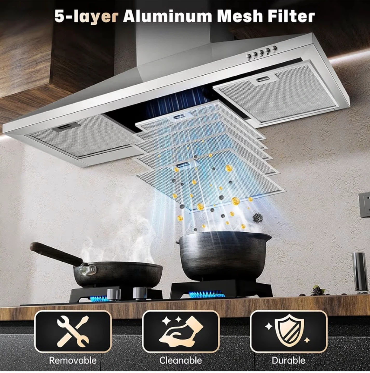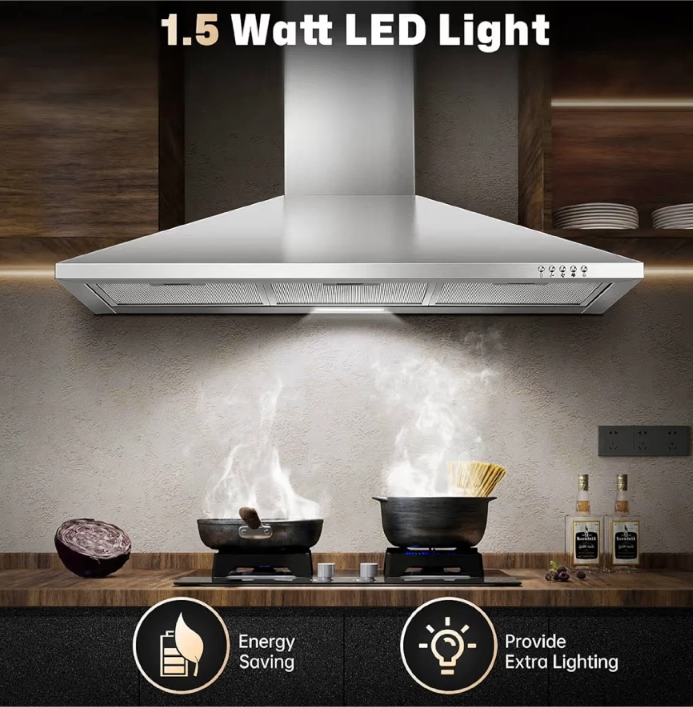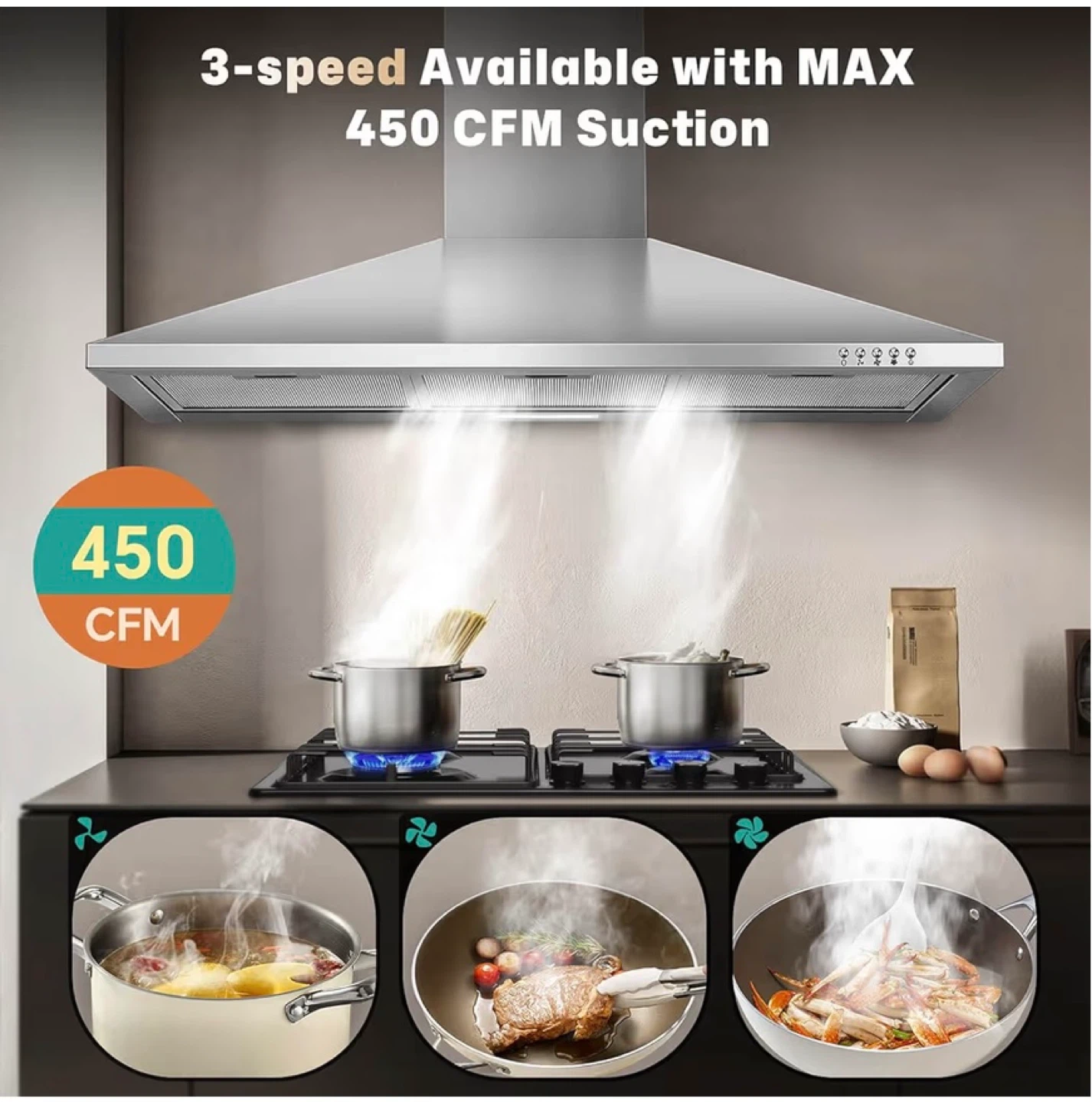 This stainless steel range hood offers 3 speeds with a maximum of 450 CFM suction. It features push-button controls for fan speed and lighting. The adjustable chimney extends from 15.7 to 30.7 inches. It's a useful addition to any kitchen!