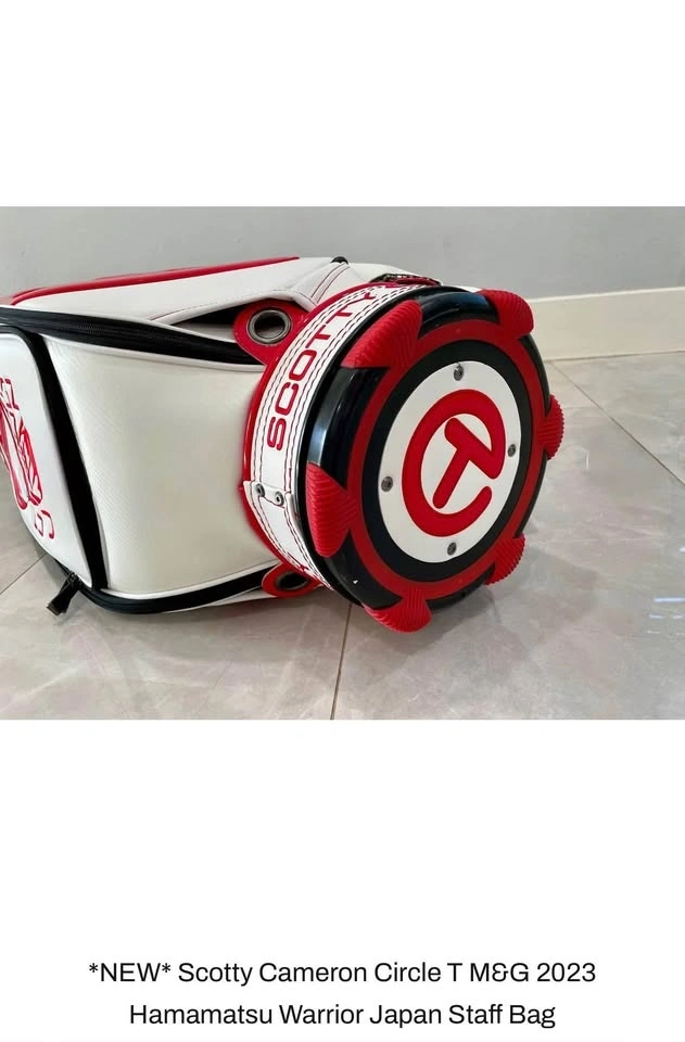 This is a 1 out of 50, limited release Scotty Cameron Hamamatsu Warrior staff bag, and it's the only one in Canada. It's a tour-grade bag designed for professional golfers, built for functionality and durability on the course with Circle T (Tour Only) craftsmanship. You'll appreciate the smart design: magnetic pocket closures, velour-lined valuables pockets, dual water bottle holders, and a stable rubberized base for cart or turf. The beautiful Hamamatsu Warrior motif and Japanese graphics add a unique flair. It features a full-size 9.5″ staff bag with a 6-way top, offering excellent club organization and balance. Engineered for heavy-duty use with thermal plastic molded foot pads for stability. It has multiple zippered compartments for apparel, balls, and accessories, plus a velour-lined pocket to protect your valuables. Convenient dual drink sleeves and a metallic cooler compartment keep beverages handy. Every zipper pull is custom “Cameron” branded. The striking black and red color scheme with Circle T logos and “For Tour Use Only” embroidery symbolizes its professional tour craftsmanship. The Hamamatsu Warrior graphics honor Scotty’s Japan Museum & Gallery heritage. This bag is built to be played and offers the performance benefits on course and the prestige that comes with a rare Scotty Cameron piece. It delivers tournament-level quality and reliability. The comfortable padded strap, balanced weight, and thoughtful pocket layout make it a joy to use. It's in mint condition. Feel free to message if you have any questions!