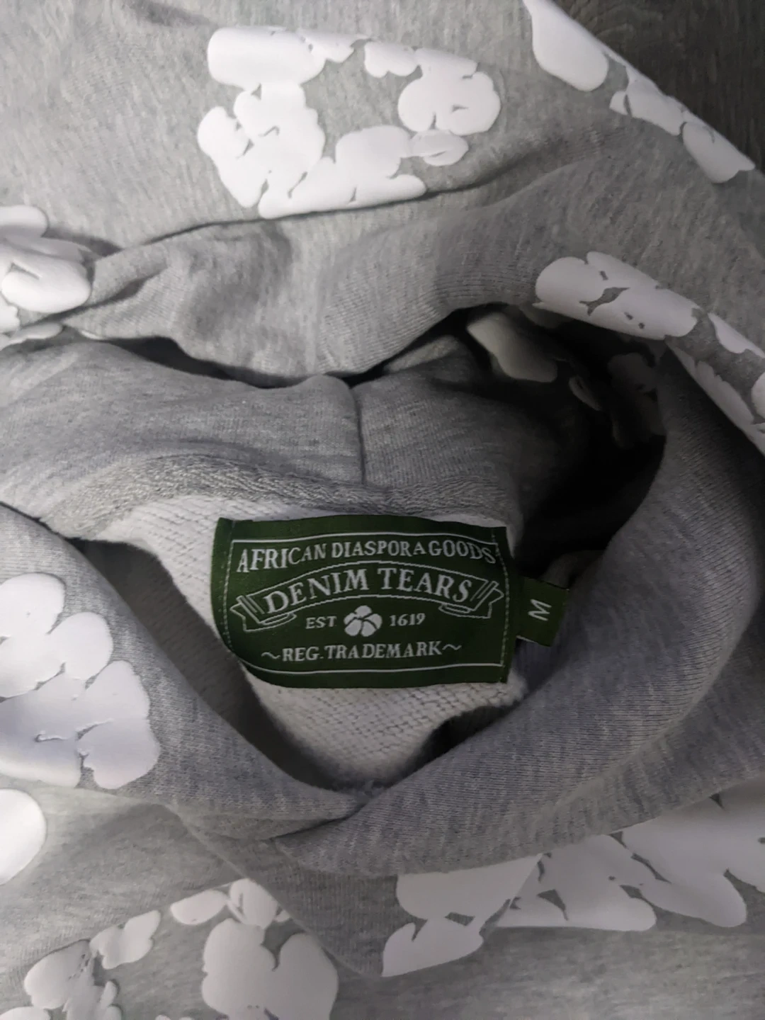 Denim Tears hoodie in grey with white cloud pattern. Size M. Features a front kangaroo pocket and hood. Made from a soft cotton blend.
