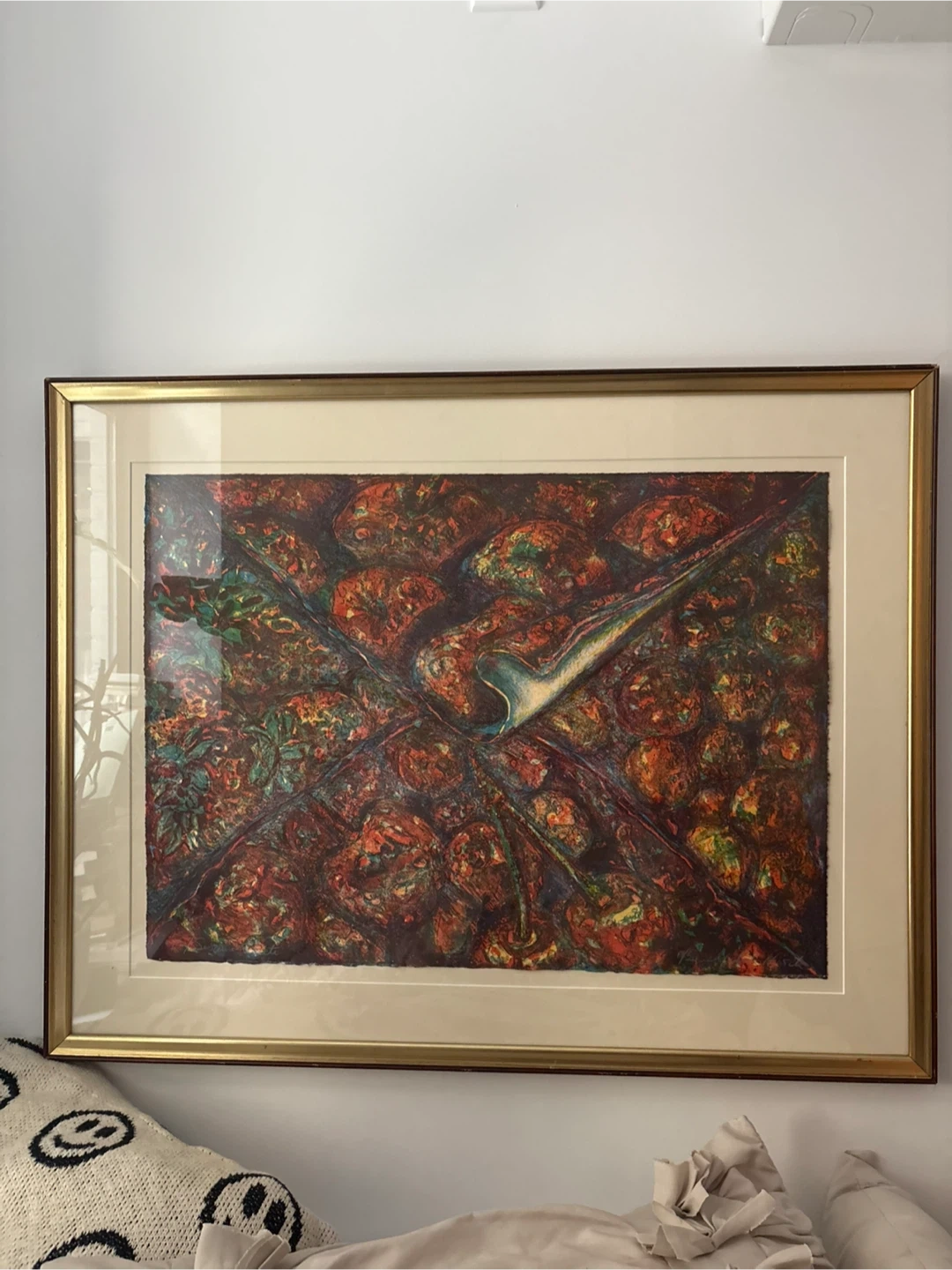 This is a framed art print with an abstract design. It features a colorful, textured pattern with deep reds, oranges, and blues. The artwork is housed in a simple gold-tone frame. It's ready to hang and would add a unique touch to any room!