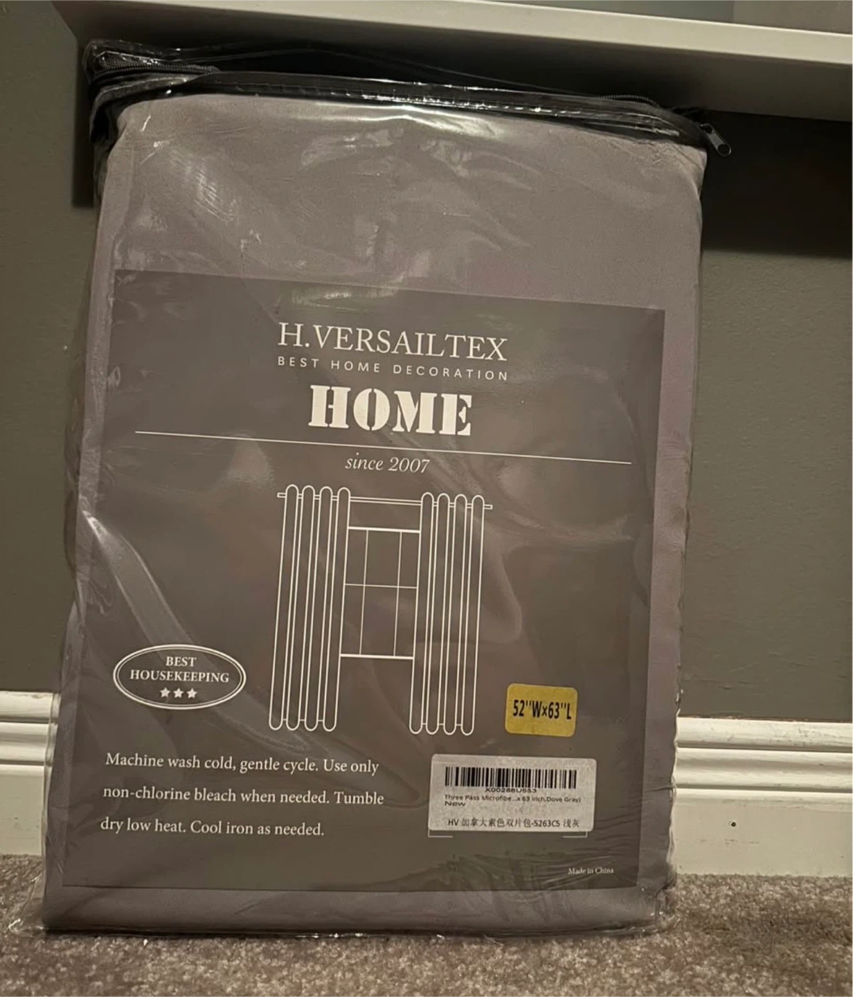 These H.Versailtex Home curtains are made from three-pass microfiber. They are 52 inches wide by 63 inches long. The colour is Dove Gray. Machine wash cold on a gentle cycle and tumble dry low heat. Cool iron as needed. Use only non-chlorine bleach when necessary.