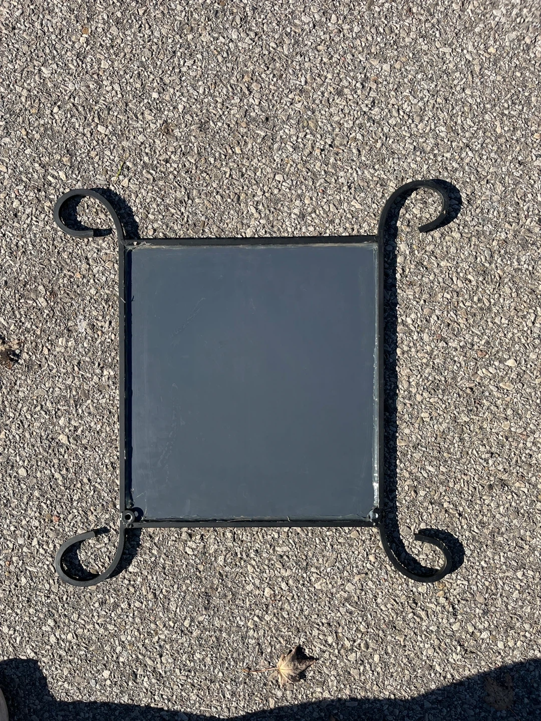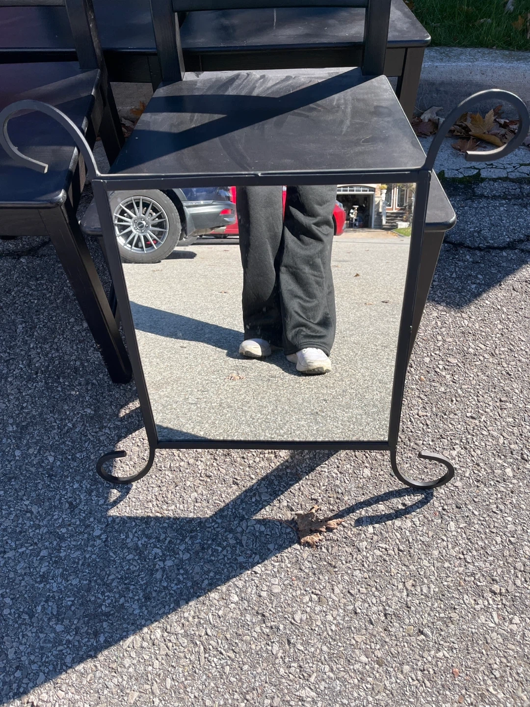 Selling a cute black metal framed mirror! It has a square mirror with decorative metal legs. It's in good condition and would look great in any room