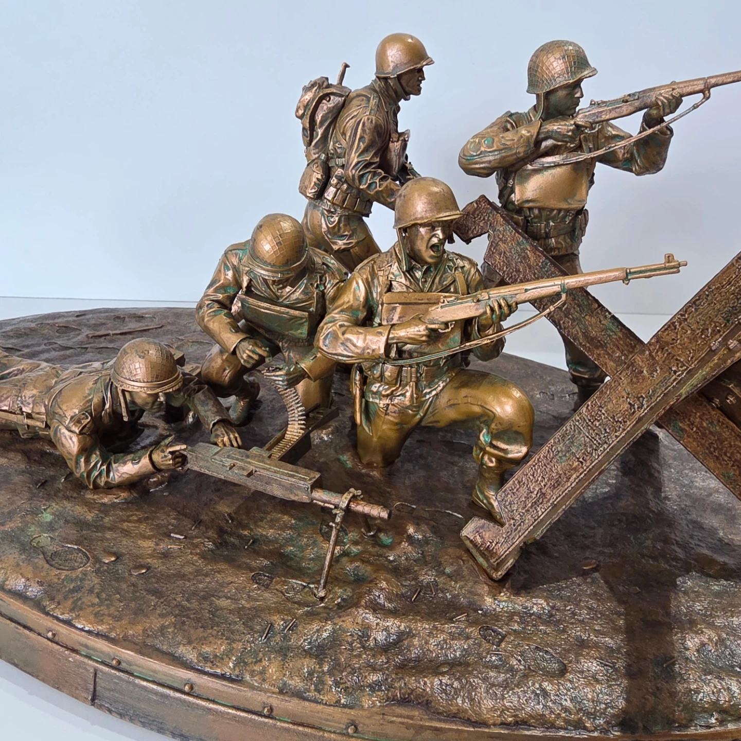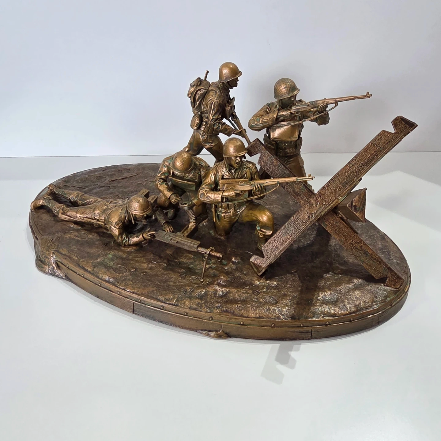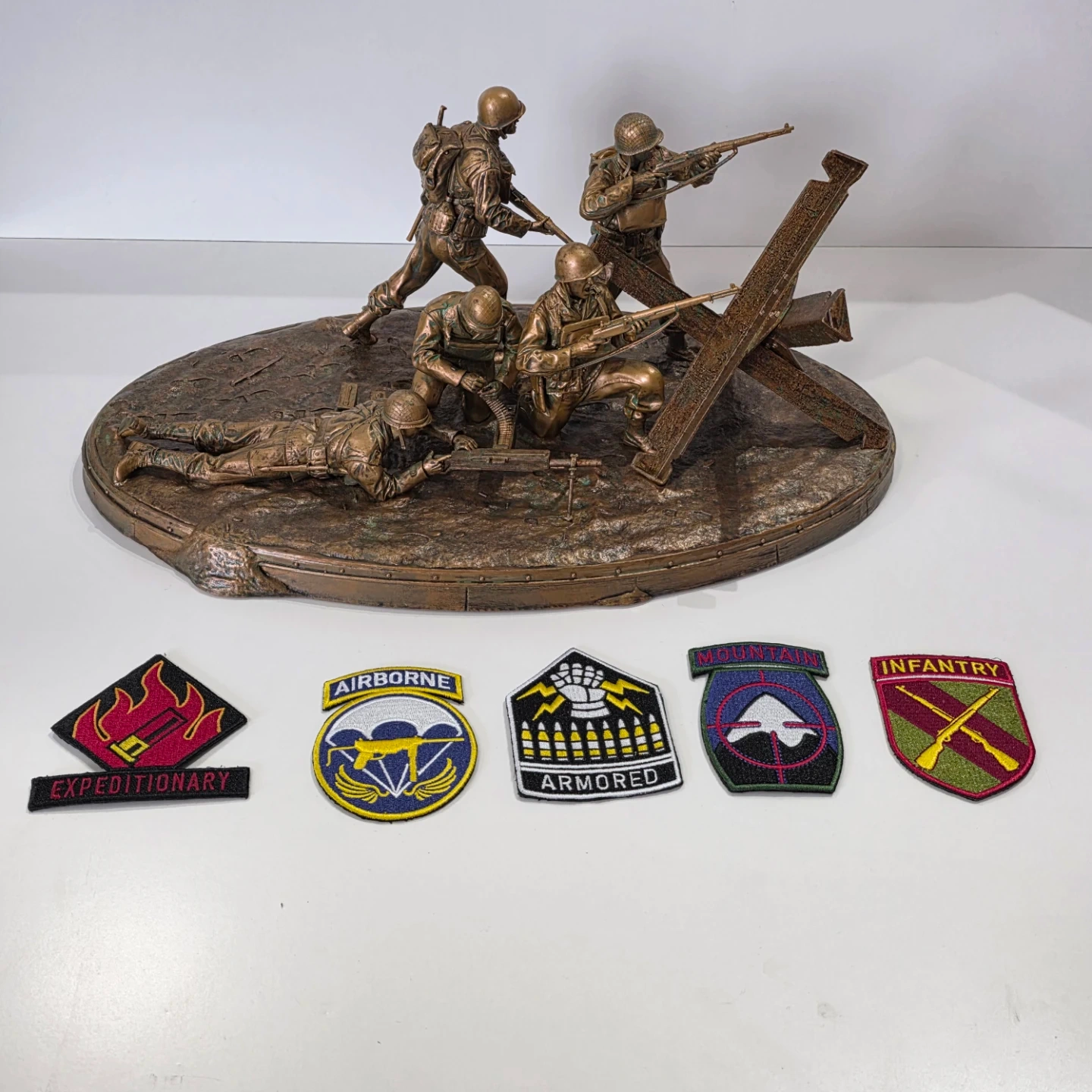 This is the Call of Duty WWII Valor Collection statue. It features a detailed bronze-finish sculpture of soldiers in combat. The collection also includes a 'Fearless' poster and other memorabilia.