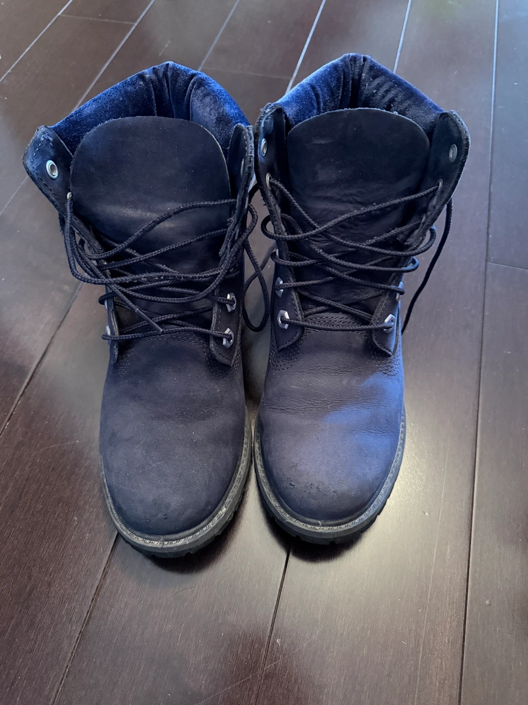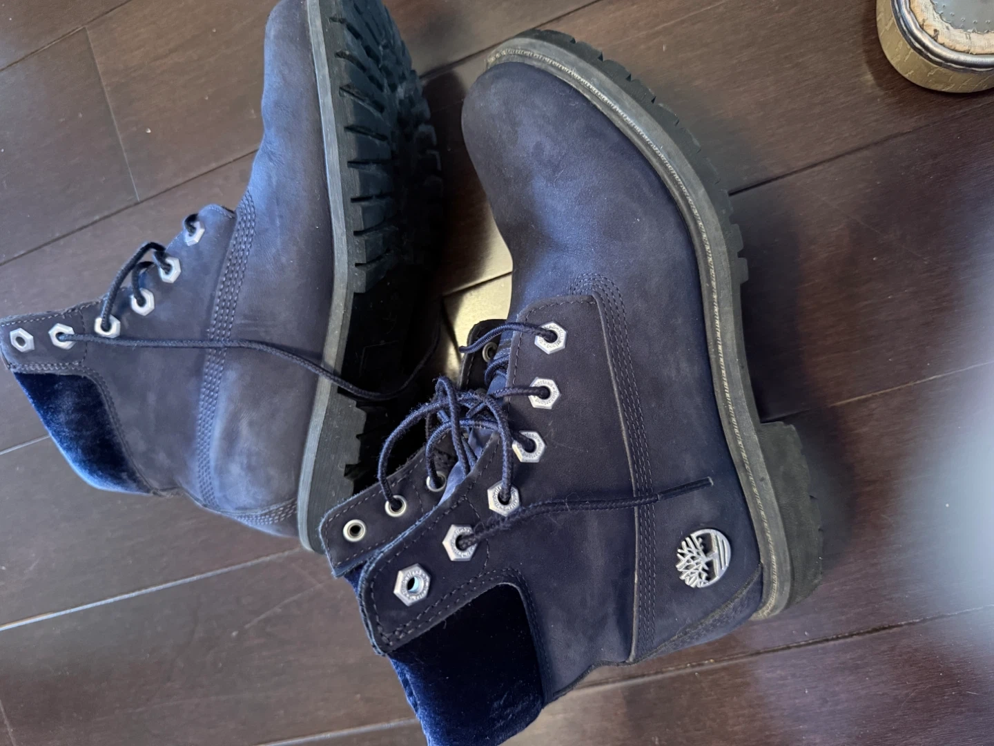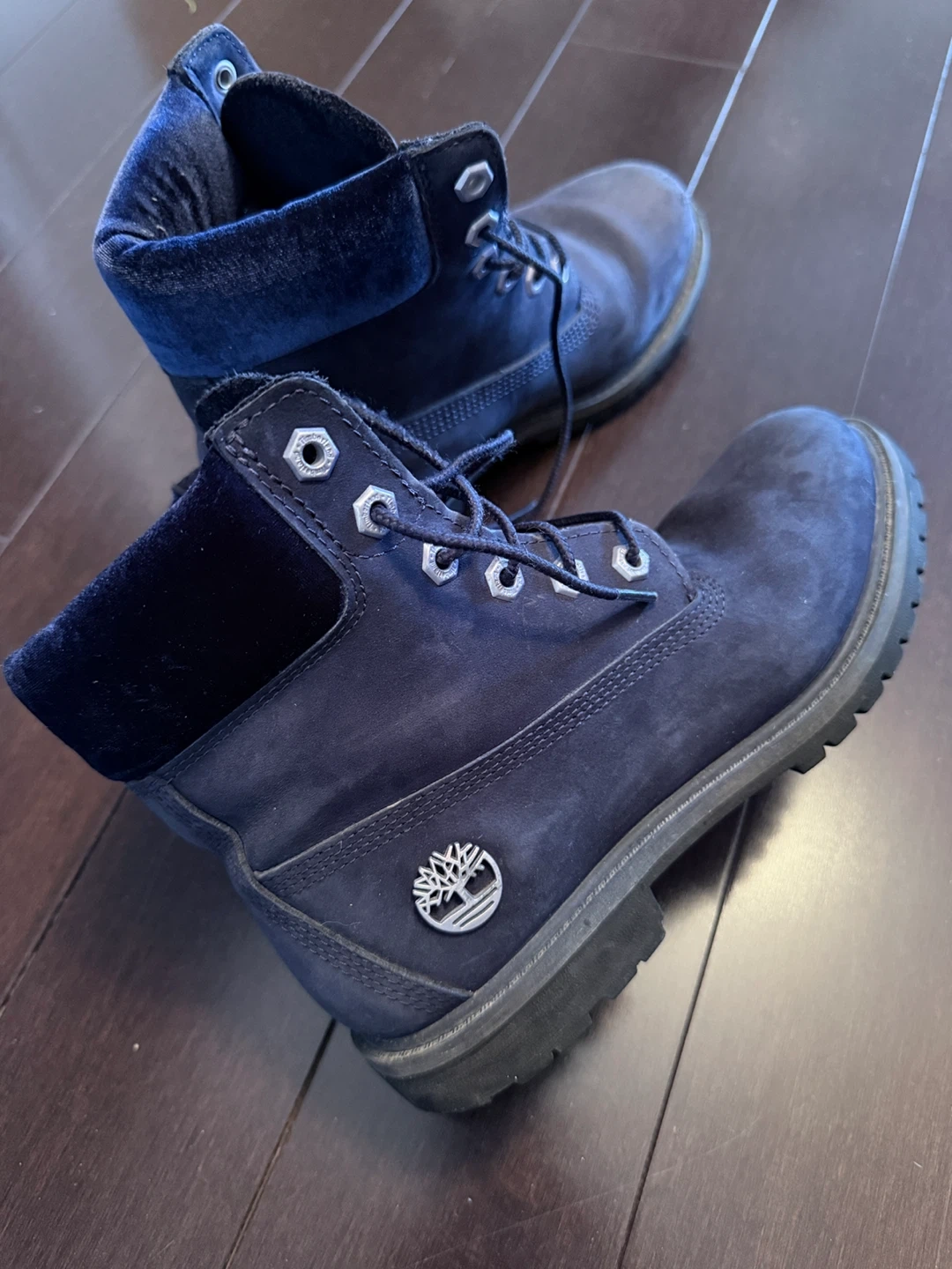 Timberland boots in a rich navy blue colour. They're made with suede and feature velvet accents around the ankle. Lace-up closure for a secure fit. These boots are perfect for everyday wear.