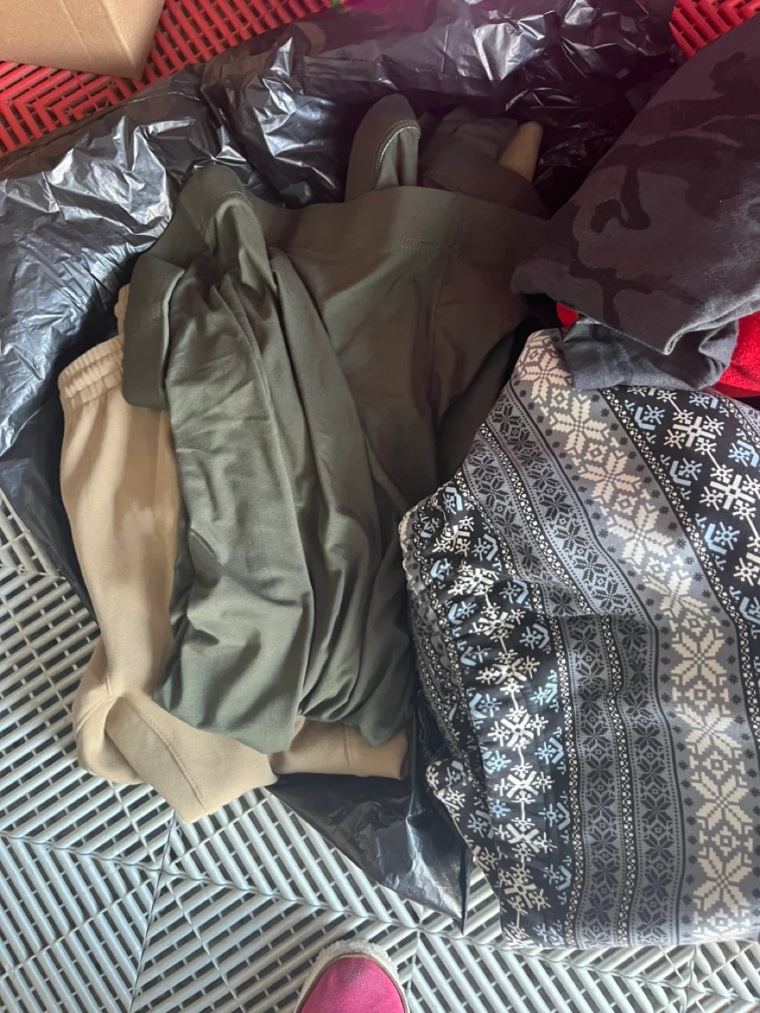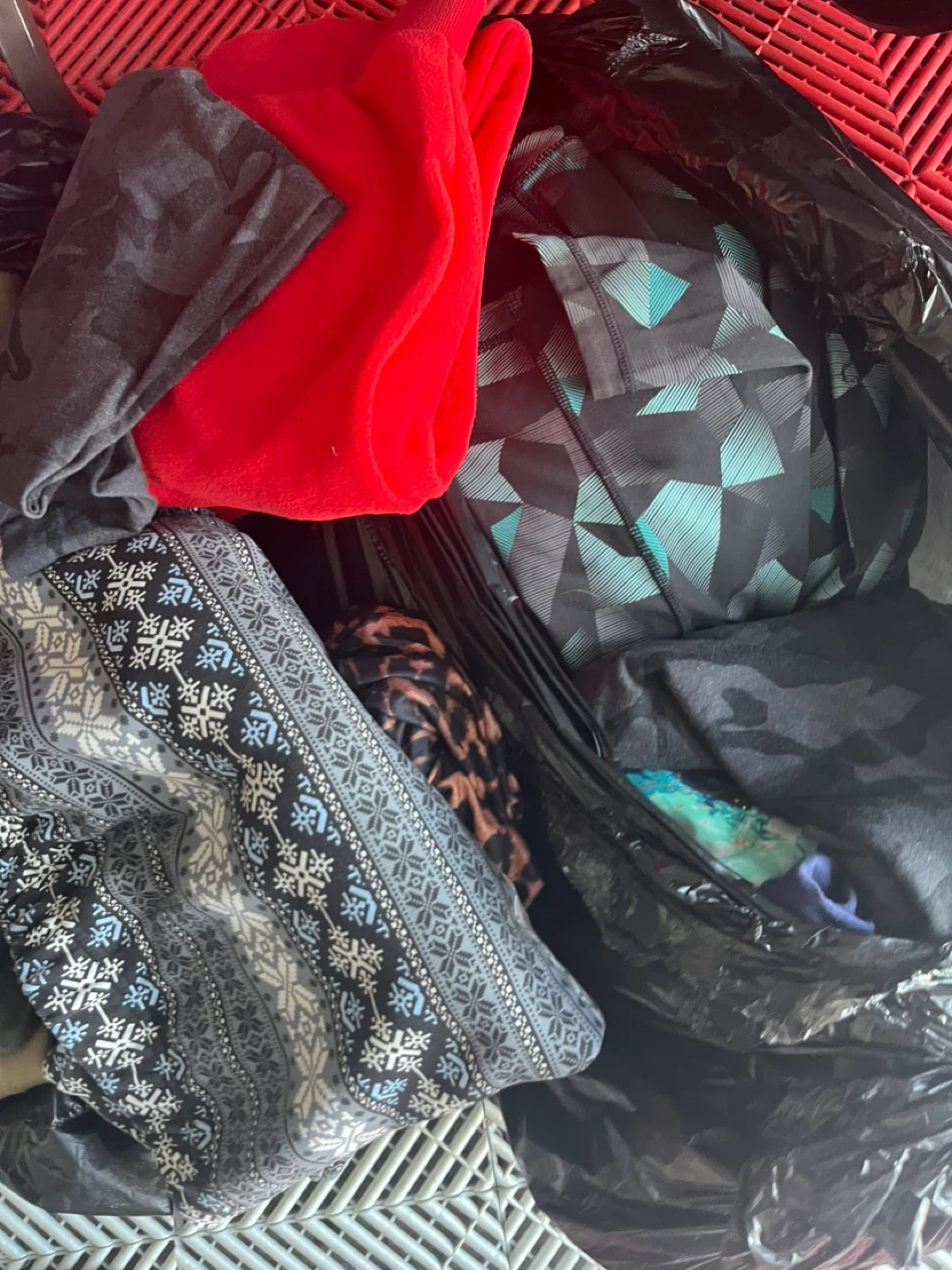 Bundle includes various leggings, sweatpants, and tops. Items are in different colours and patterns. Mostly athletic or lounge wear styles. Great for active or casual wear!
