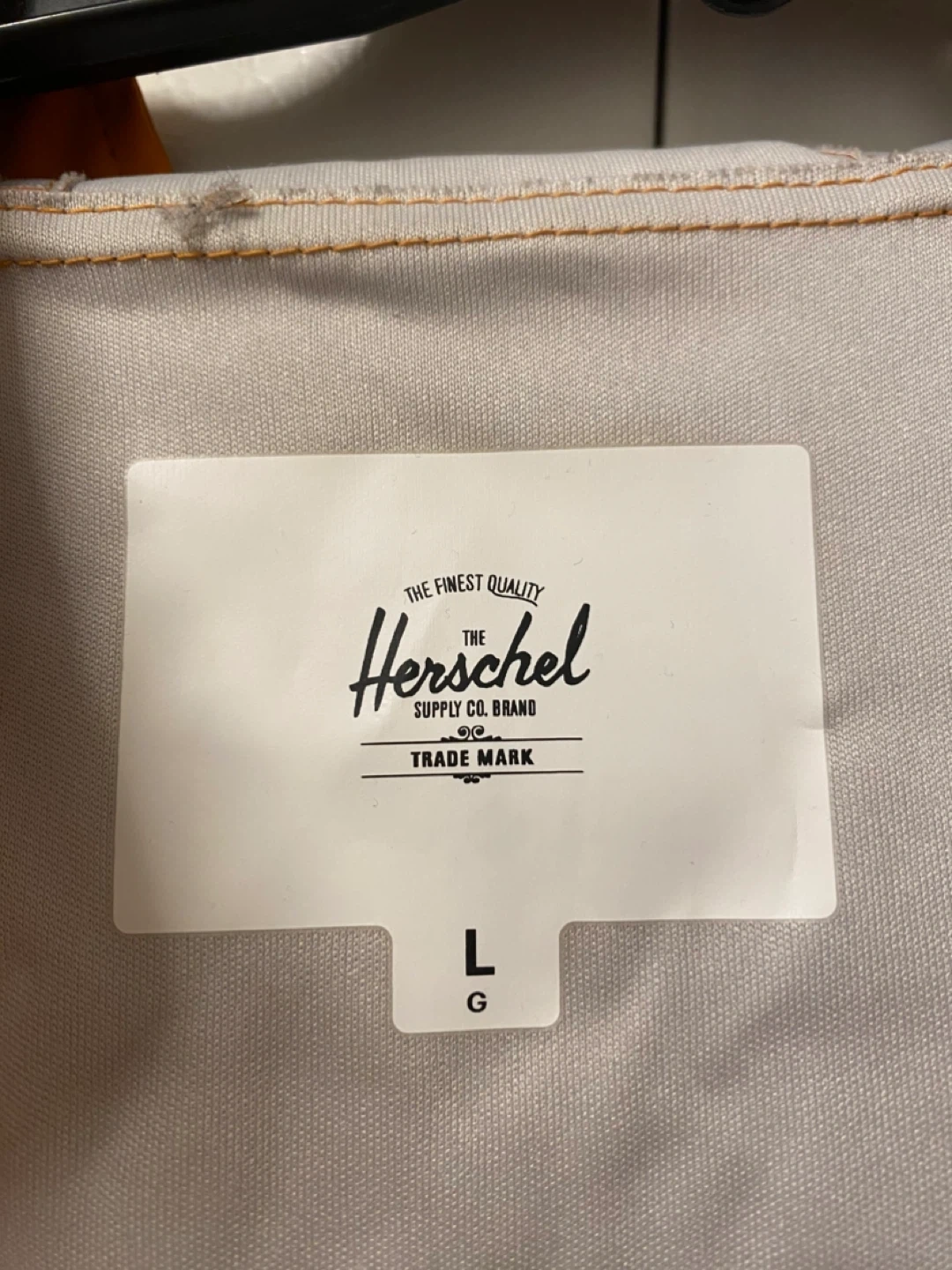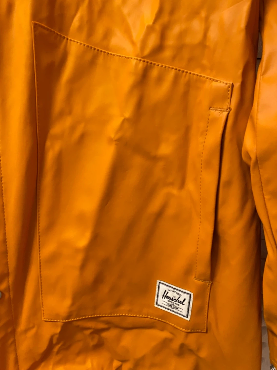 This is a Unisex Herschel Supply Co. rain jacket in a vibrant orange colour. It's a size large and features a hood and front pockets. It's made from a water-proof material. A great jacket for keeping dry on rainy days!