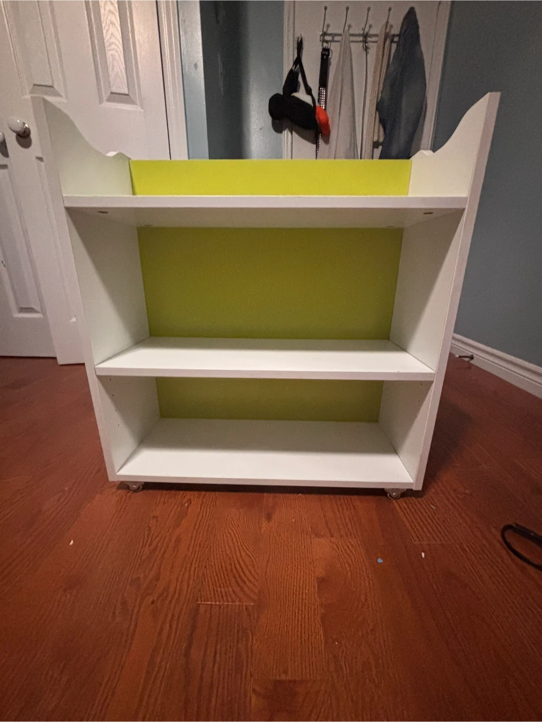 This white bookcase features a vibrant green backing and three open shelves. It's mounted on wheels for easy moving around your space. It's perfect for organizing books or displaying decor.