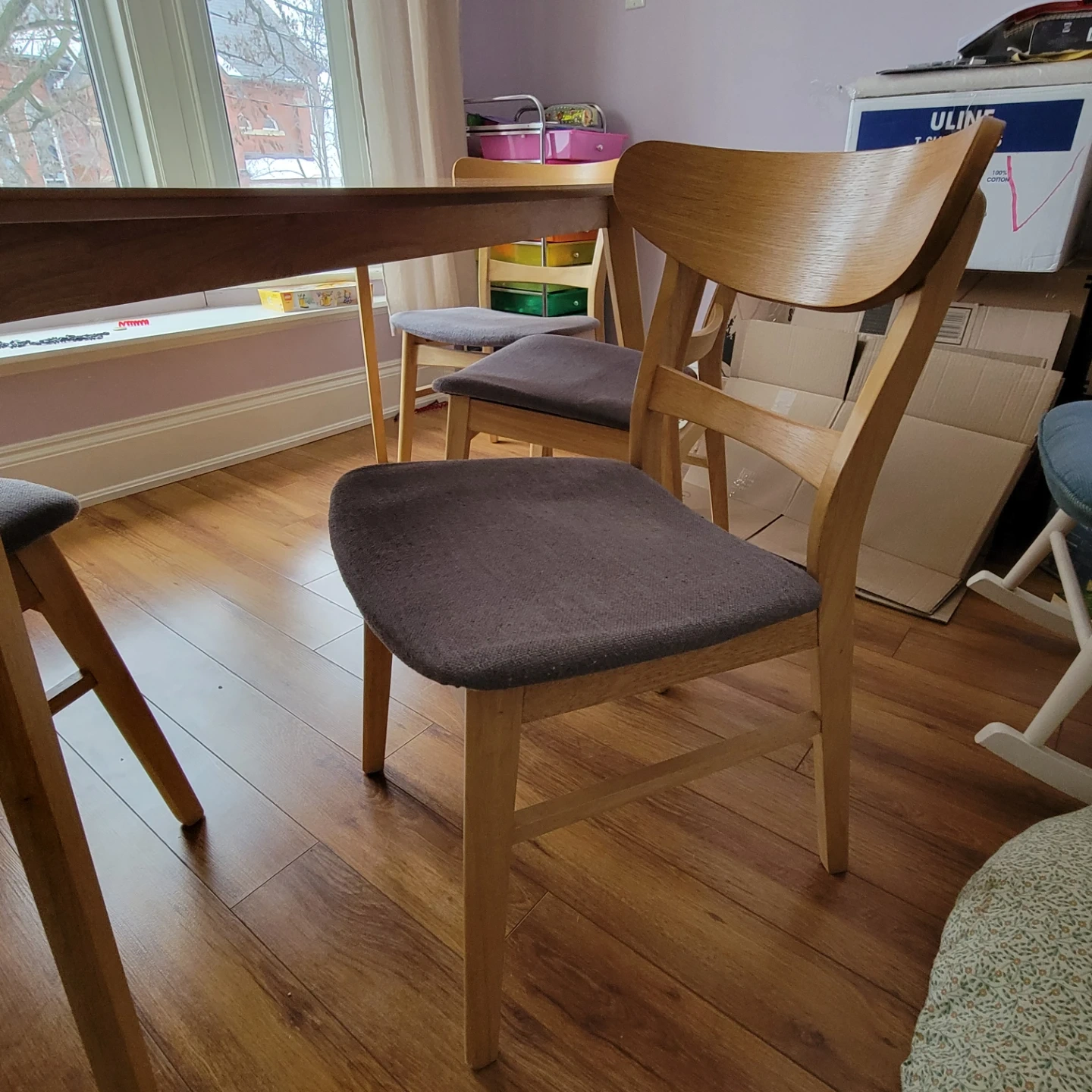 Light wood dining table + four matching chairs with grey upholstered seats. A few faint scuff marks, but nothing major. I accept e-transfer, and will leave it on the porch for pickup. Get this thing off my porch and into your home!