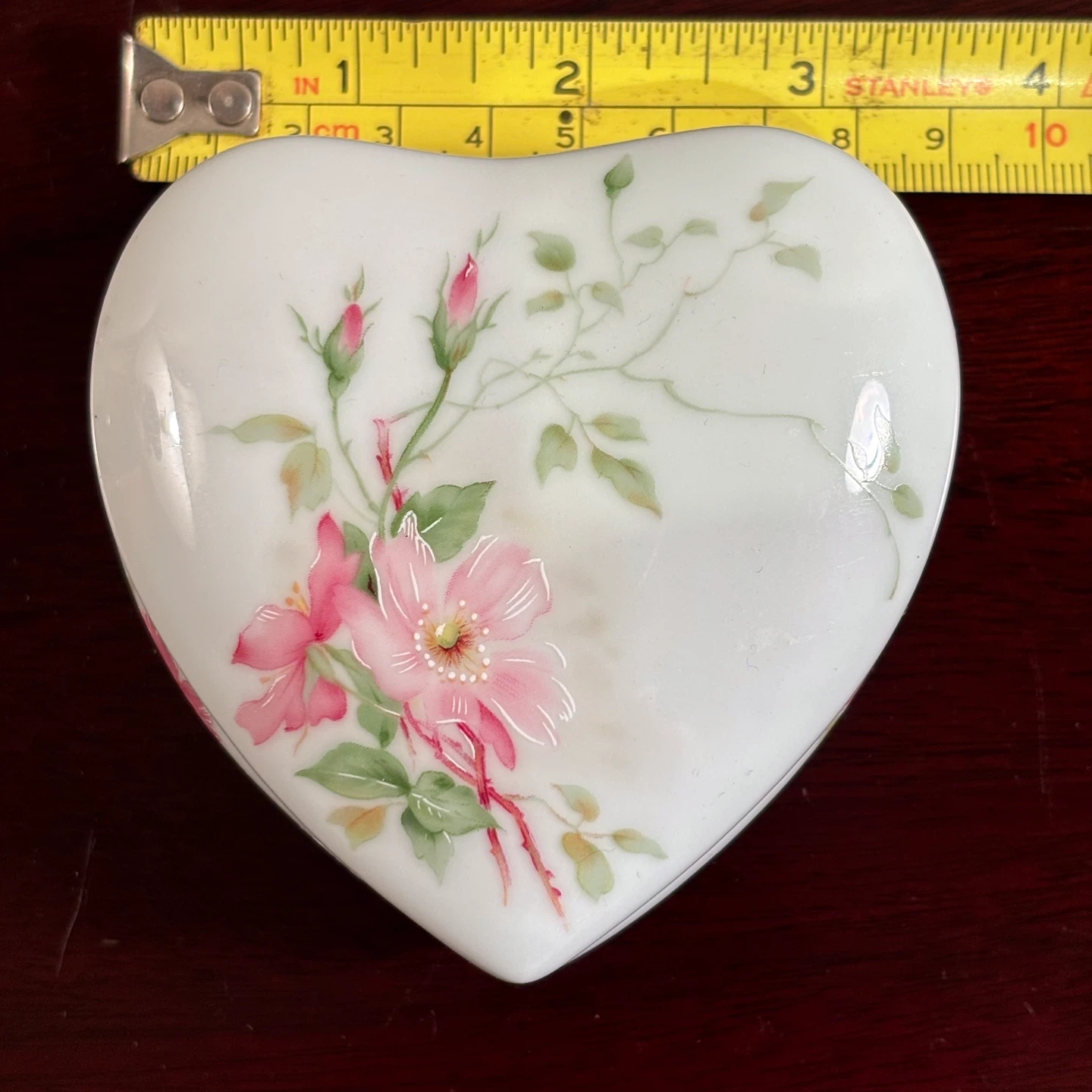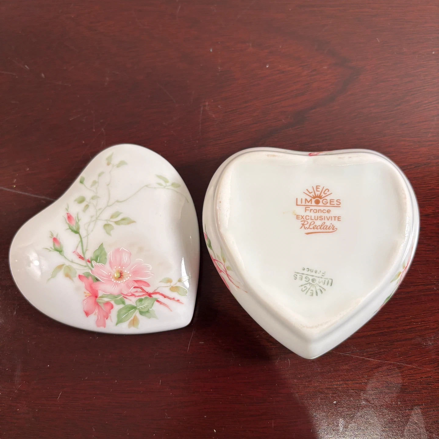 Lovely heart-shaped porcelain trinket box from LEC Limoges France for R.Lecair, featuring delicate floral hand-painting. It's perfect for storing small treasures. The gold trim adds a touch of elegance. A perfect Valentines or Mothers Day gift!