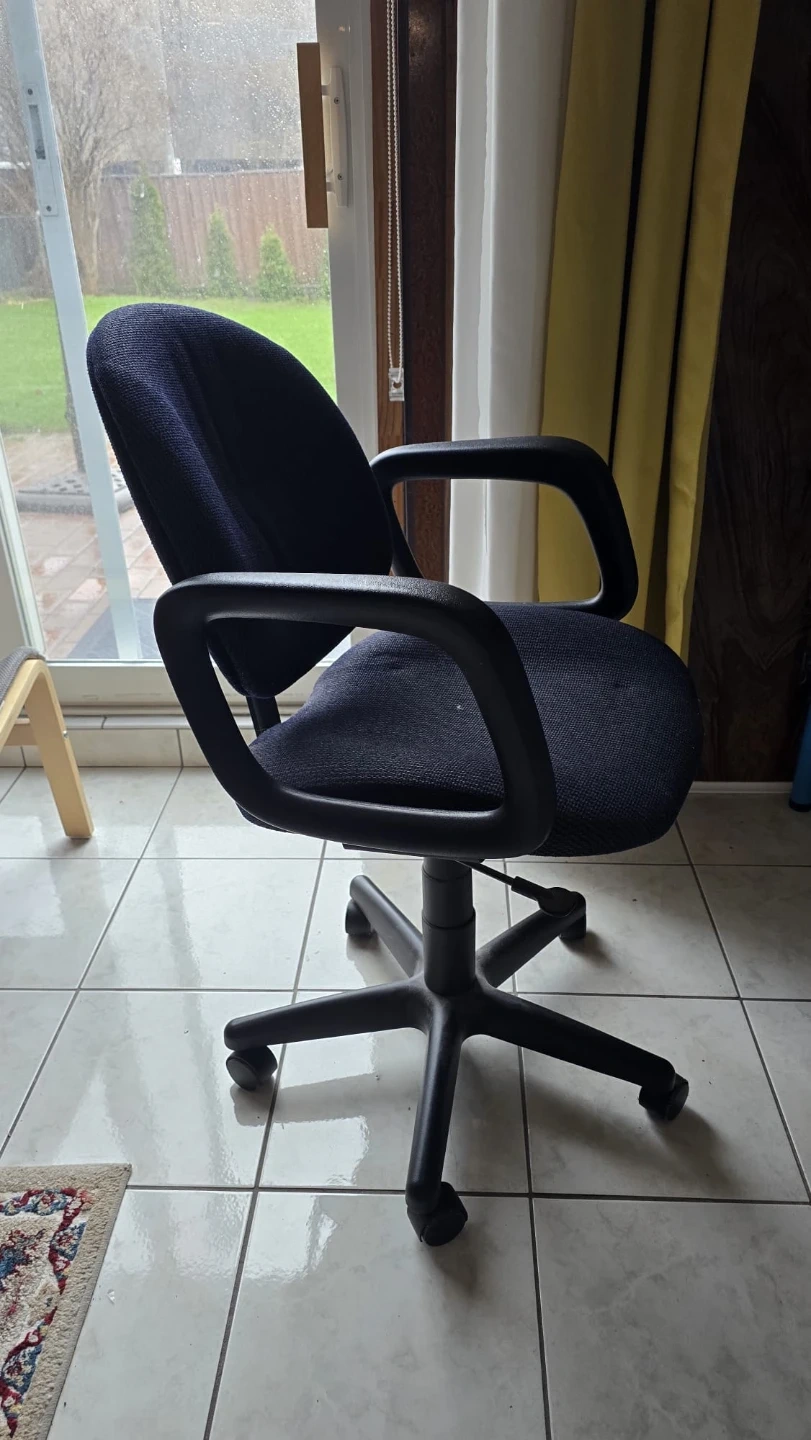 This is a dark blue fabric office chair. It has adjustable height and rolling casters for easy movement. The arms are fixed.