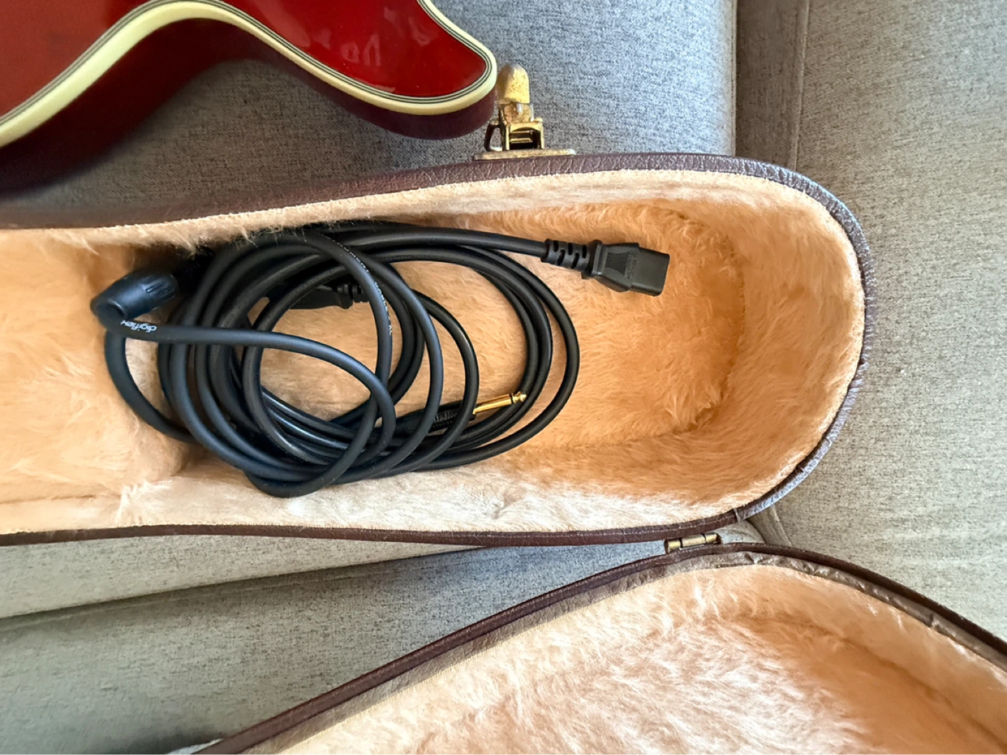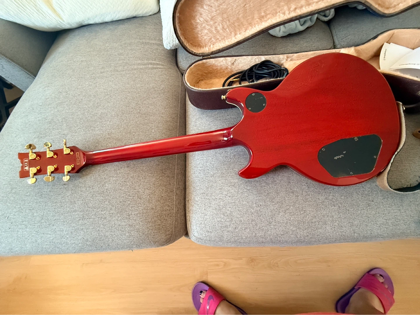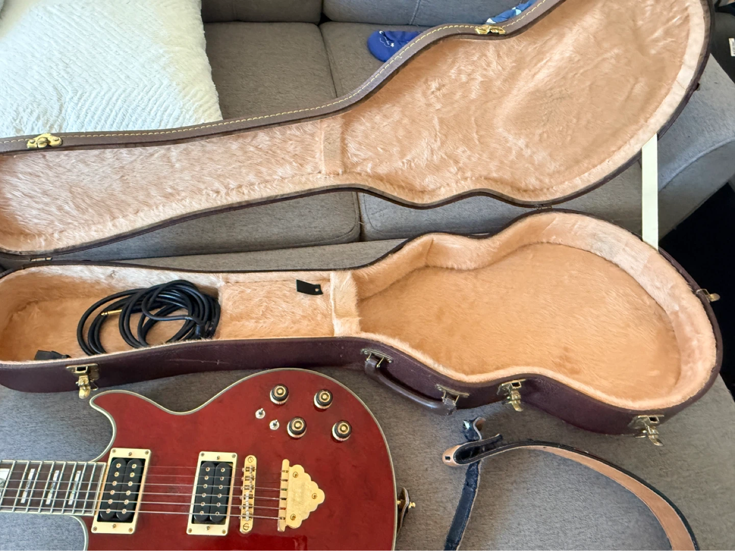Red electric guitar by Ibanez, includes case and cable. Guitar has gold hardware and a sunburst finish. Decluttering, guitar plays beautifully still, just sitting in home storage.