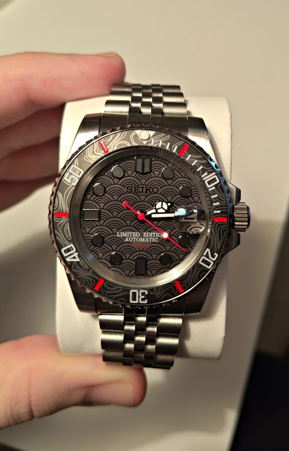 This is a Seiko MOD Limited Edition automatic watch. It features a distinctive grey dial with a wave pattern. The watch has a stainless steel band and a rotating bezel with red accents.