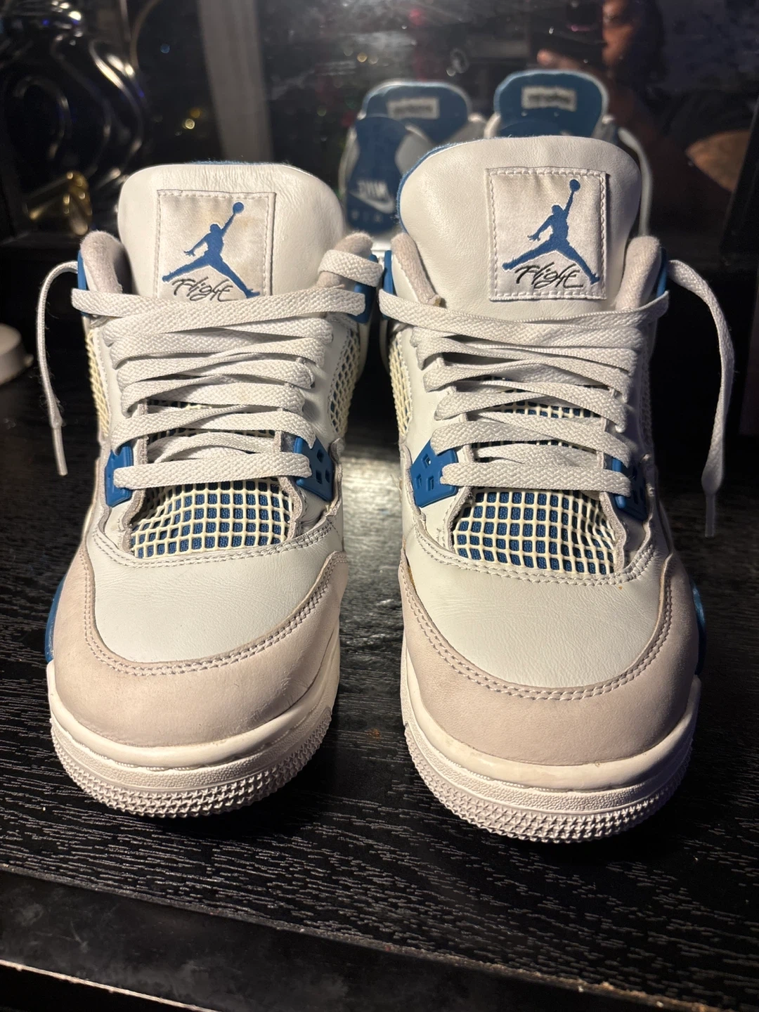 Selling a pair of Nike Air Jordan 4 Retro sneakers in white and teal. These are in great condition and ready for a new owner! They feature the classic Nike Air logo on the back.