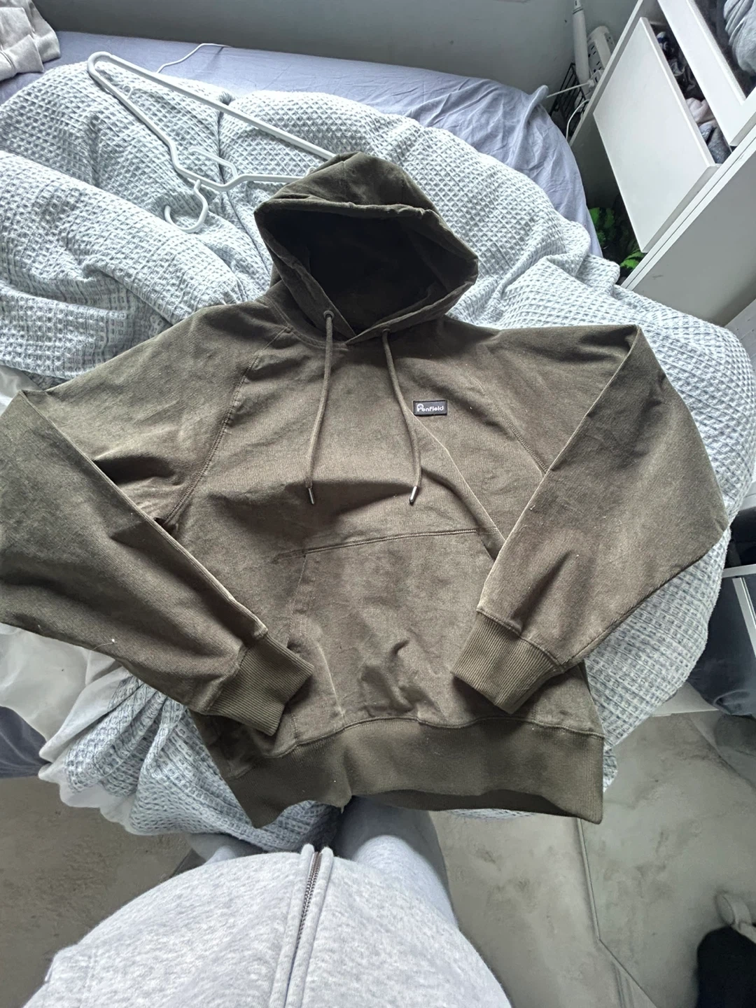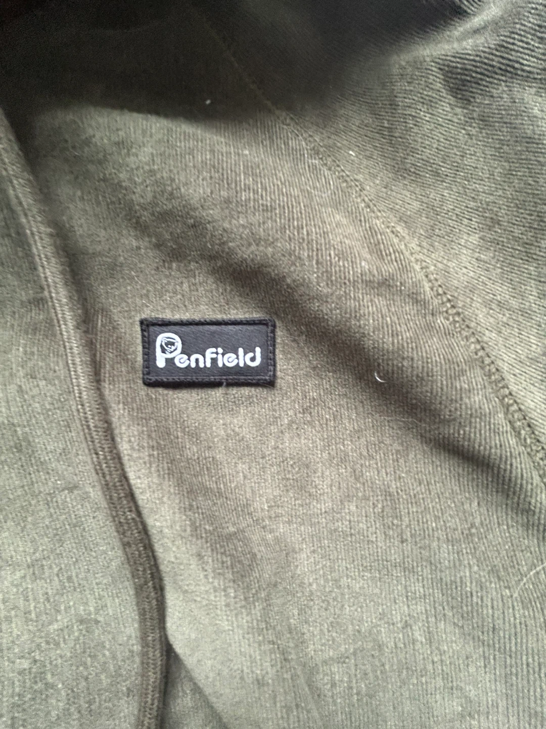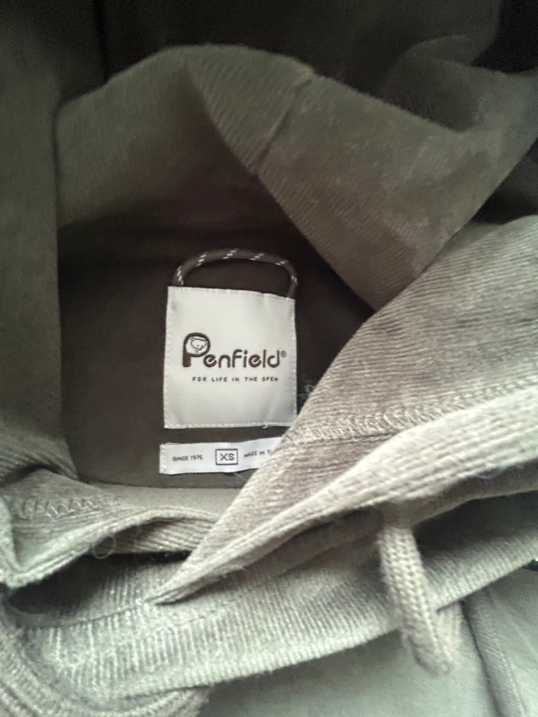 This Penfield hooded sweatshirt is a classic olive green colour. It's a size XS and features a front pouch pocket. Made in Turkey.