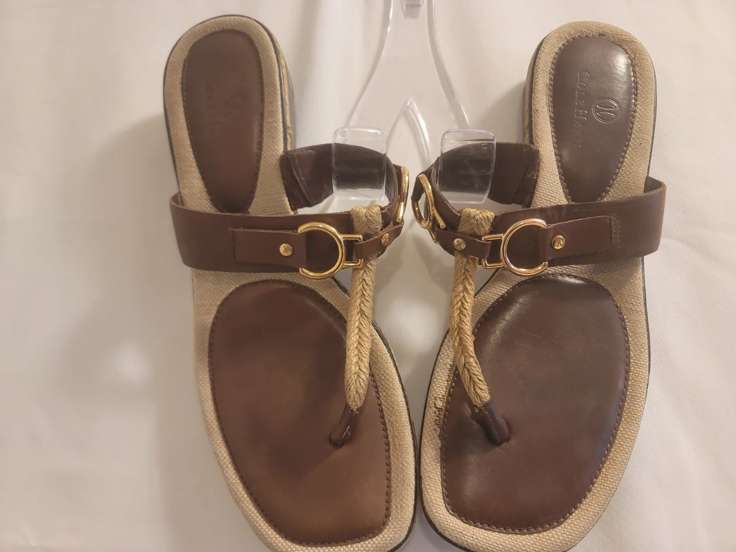 These Cole Haan thong sandals feature brown leather straps with gold-tone hardware. The footbed has a natural woven texture. Comfortable for everyday wear!
