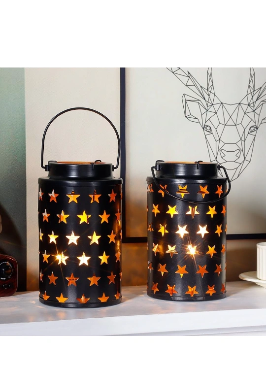 1000+Pair of black metal candle lanterns. Star cut-outs. Copper interior finish. Hanging handles. Perfect for patios, gardens, or indoor use. LED lights may fit inside (not included).